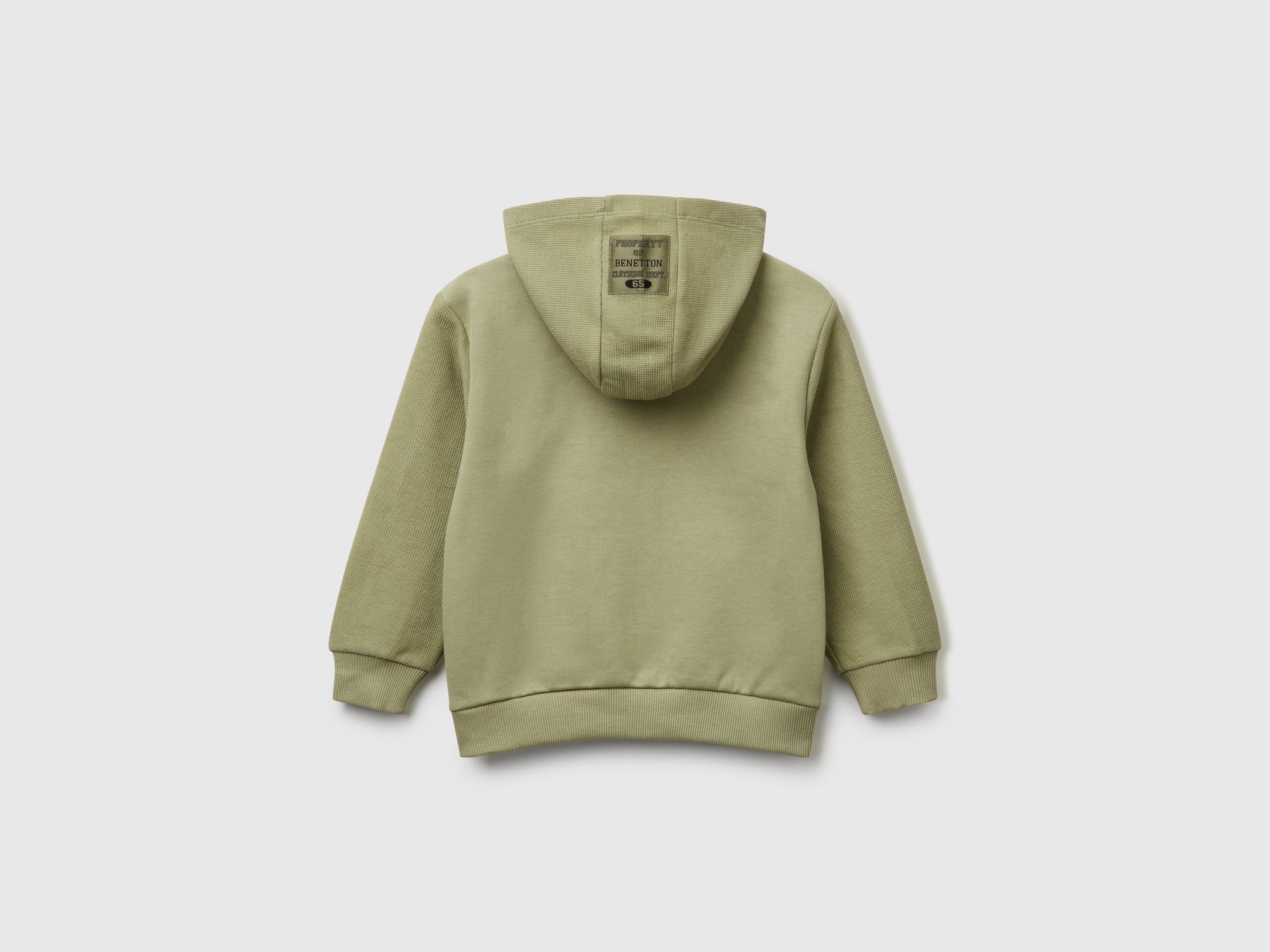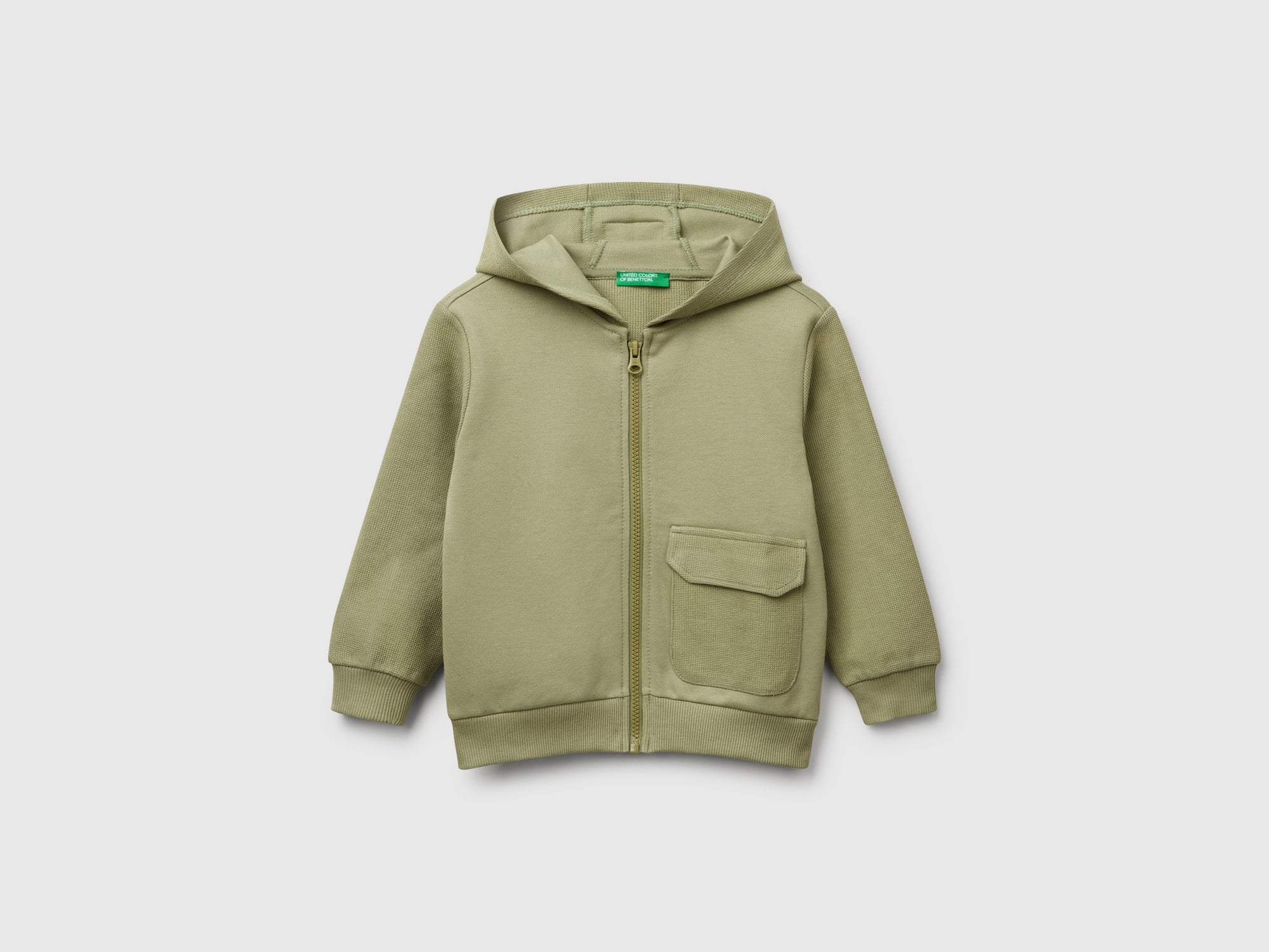 Felpa a manica lunga in morbido cotone biologico. Dotata di cappuccio, apertura frontale a zip e taschino con pattina applicato sul davanti. Articolo realizzato con tessuto contenente almeno il 95% di cotone biologico.
