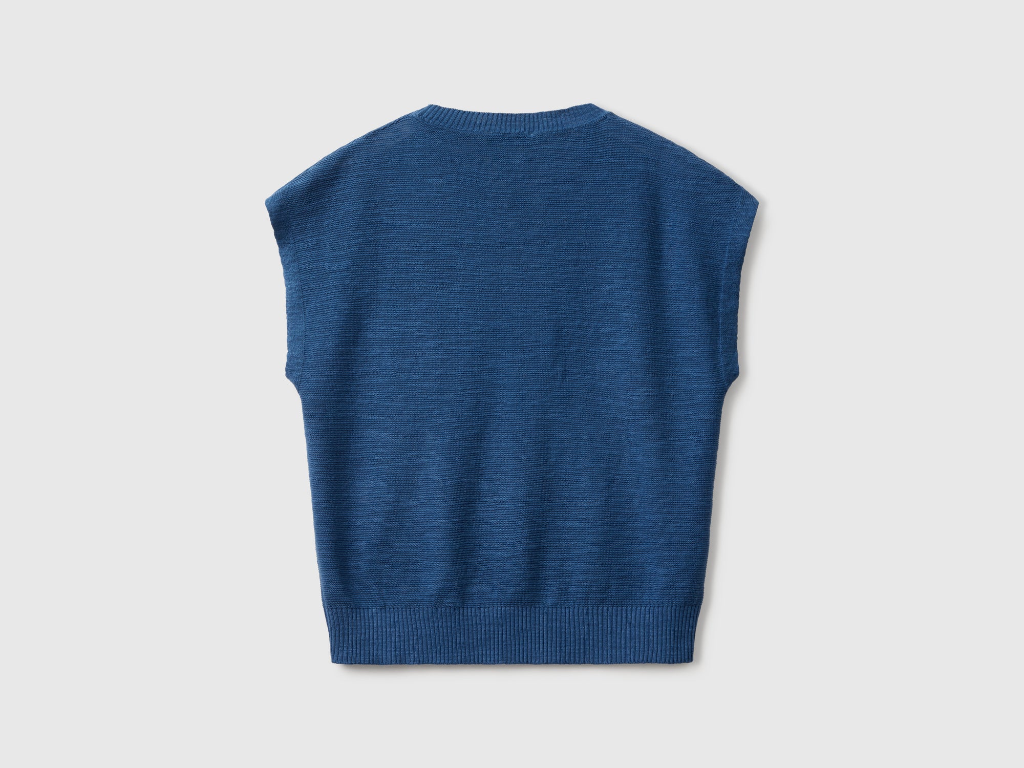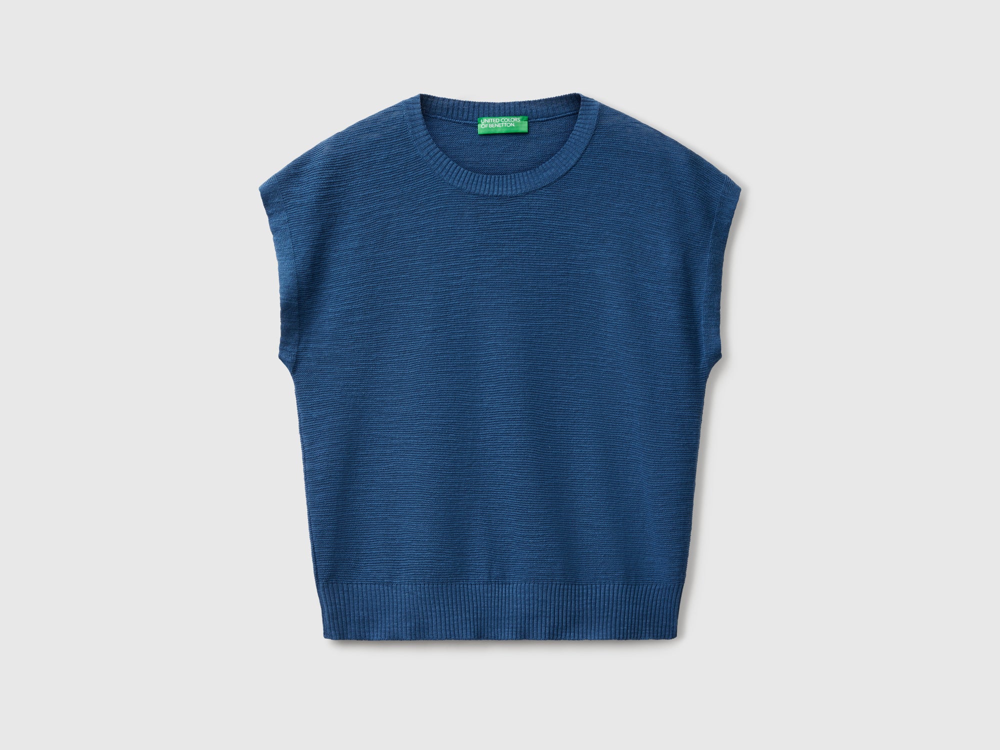 Maglia girocollo smanicata in filato soffice e leggero di misto cotone e lino. Vestibilità regolare con lunghezza al bacino. Da indossare da solo o come sottogiacca primaverile.
