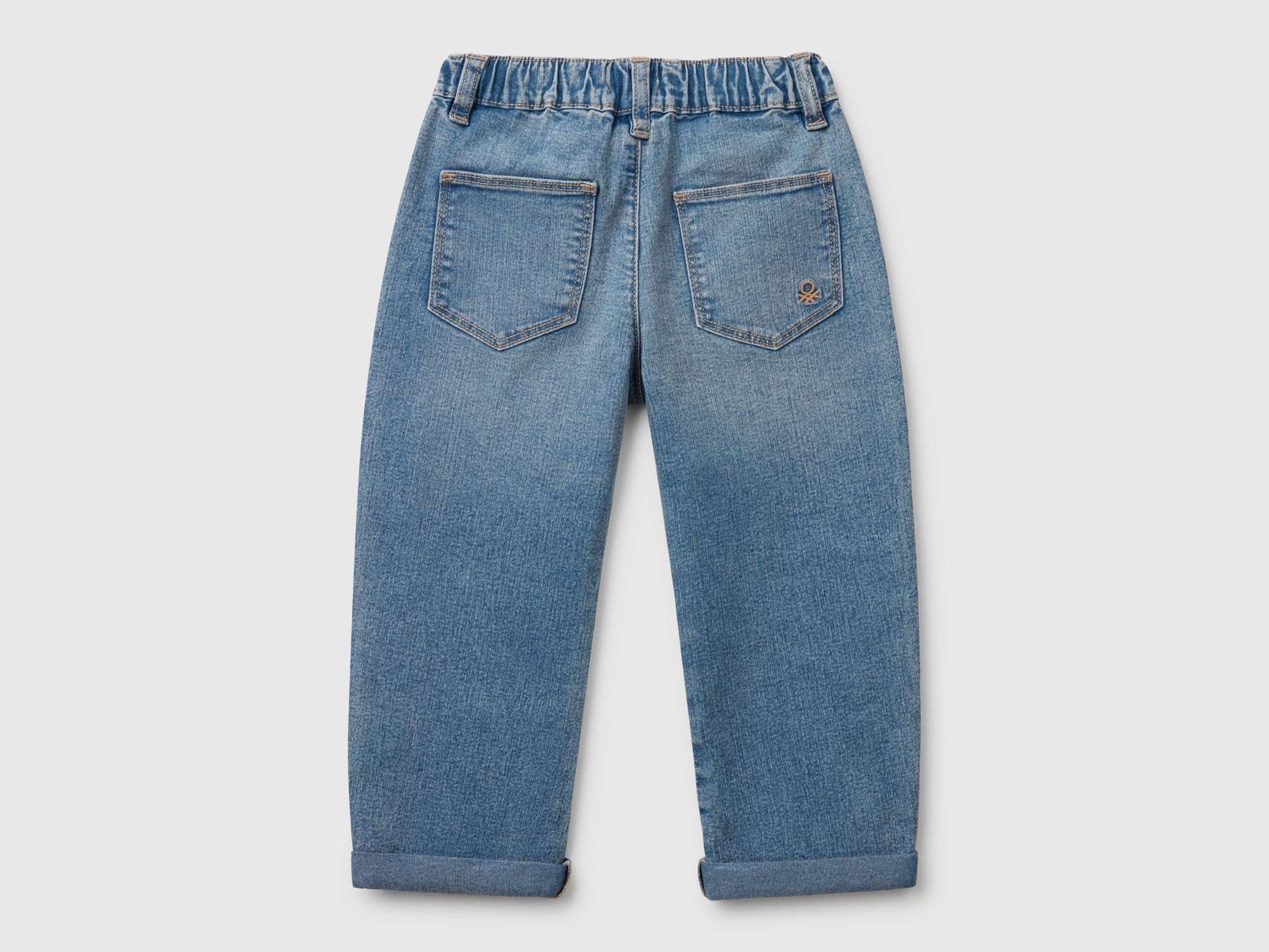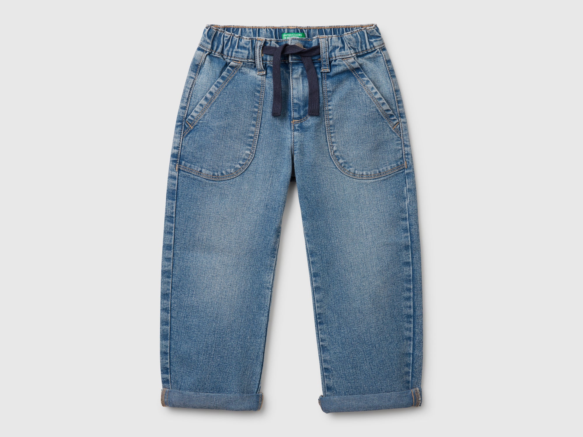 Pantaloni lunghi carrot fit in denim di cotone elasticizzato. Apertura frontale con zip e bottone, coulisse ed elastico interno sul retro e sui fianchi. Tasche davanti e taschini applicati dietro. Un capo dall'aspetto leggermente vissuto, per un look moderno e deciso.
