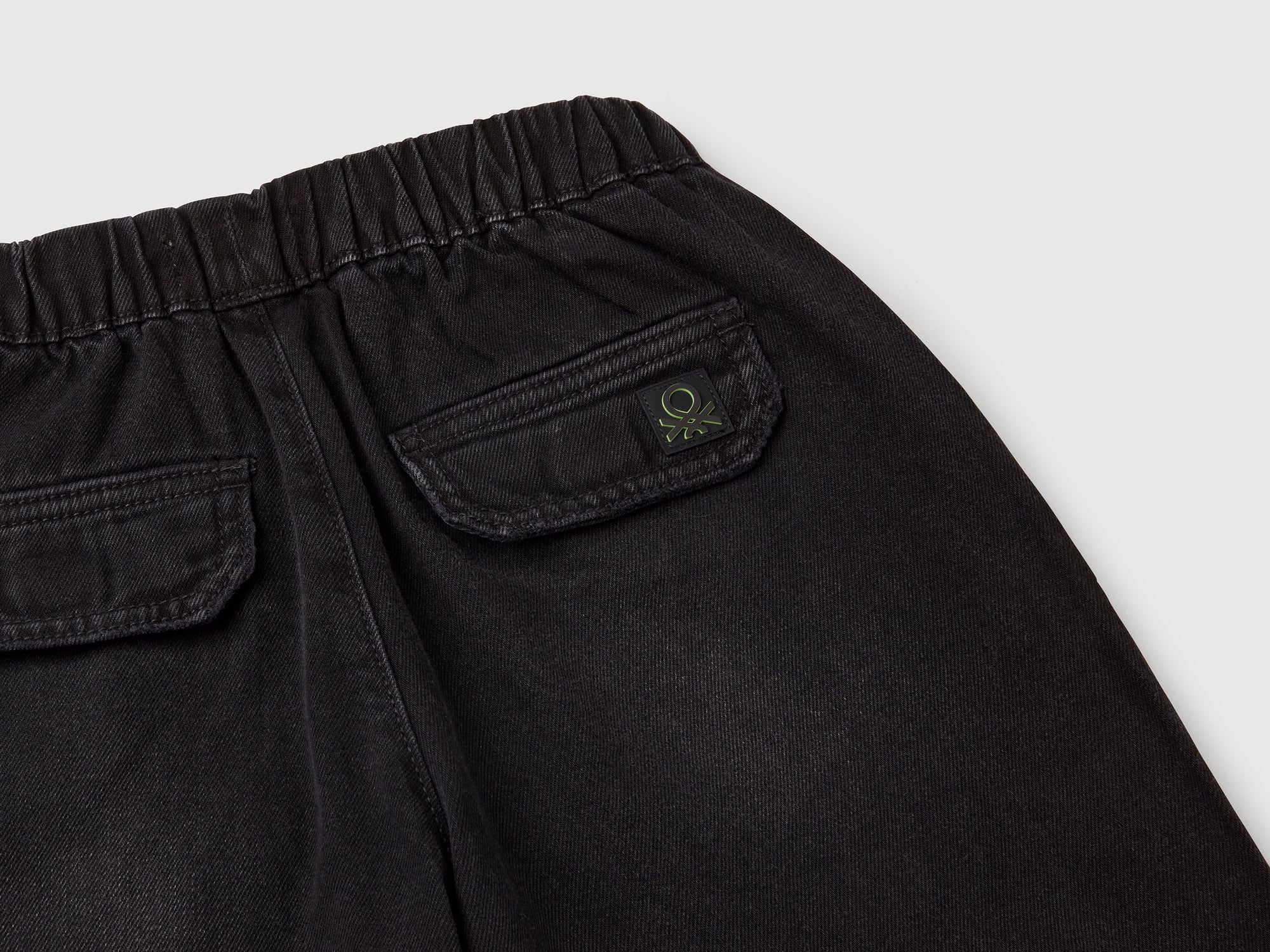 Pantaloni lunghi modello parachute in denim di puro cotone. Vita con coulisse elastica e fermacordini laterali, apertura a zip e bottone. Tasche davanti, taschini a filetto con pattina sul retro. Confortevoli e moderni.