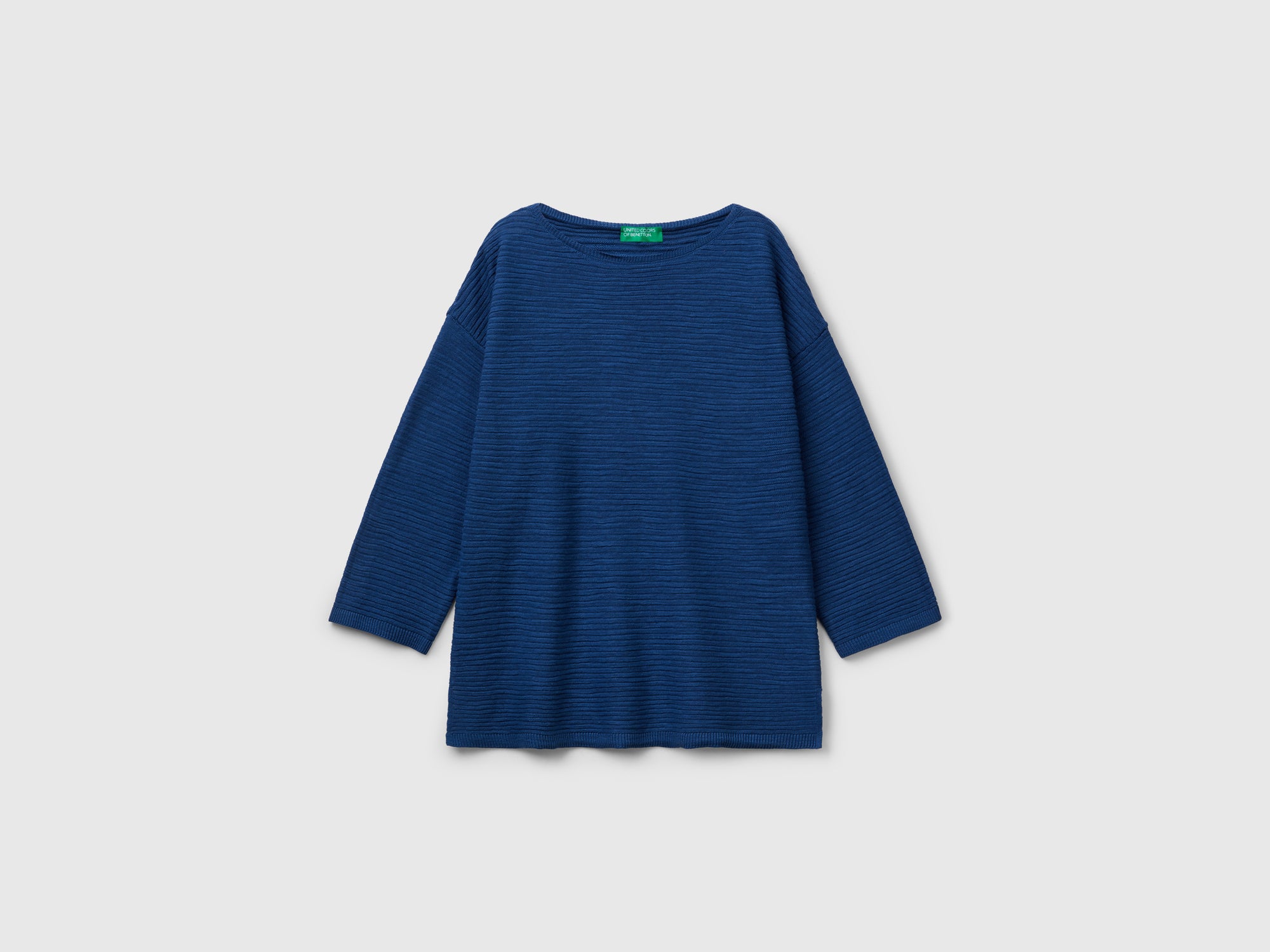 Maglioncino lavorato boxy fit in misto cotone e lino. Scollo a barchetta, manica a 3/4 e spacchetti laterali. Leggero, confortevole e quotidiano. L'aspetto non uniforme del prodotto è una caratteristica peculiare delle fibre naturali che compongono il filato.