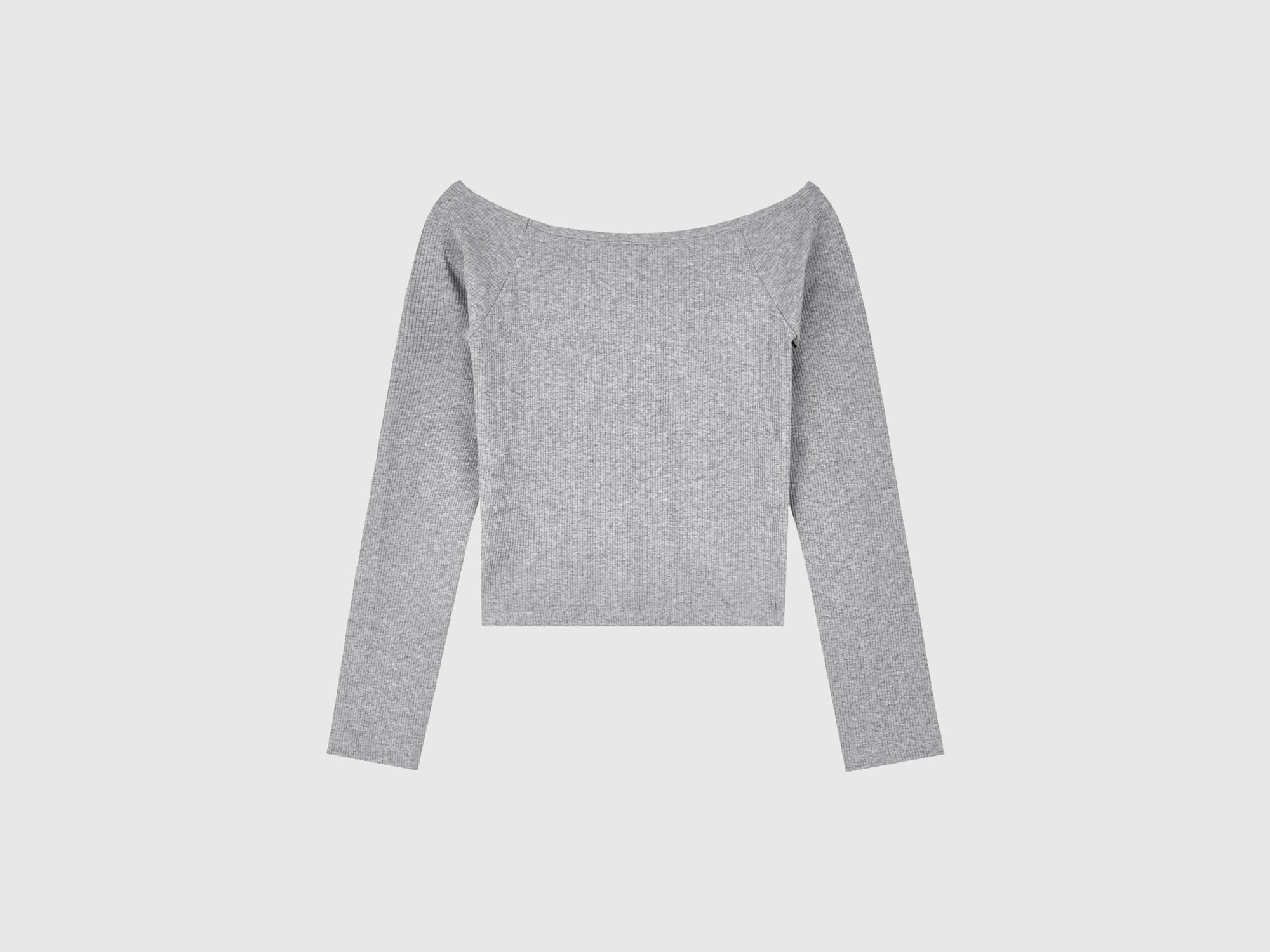 T-shirt in morbido tessuto di cotone elasticizzato. Manica lunga e scollo con spalle scoperte. Per look quotidiani, confortevoli e femminili.