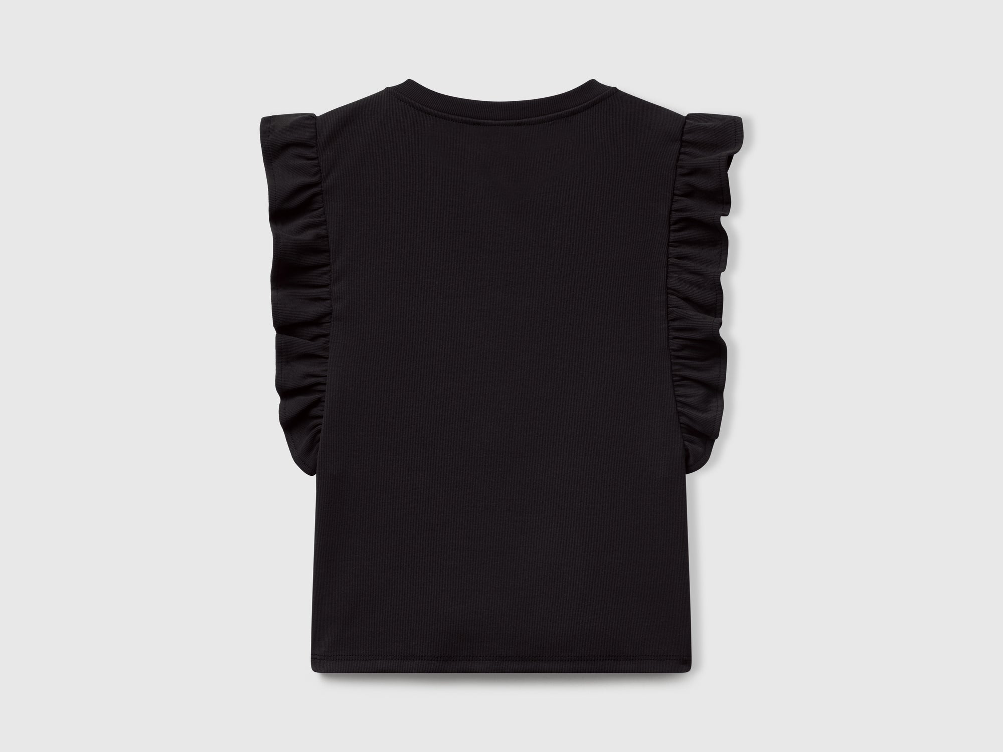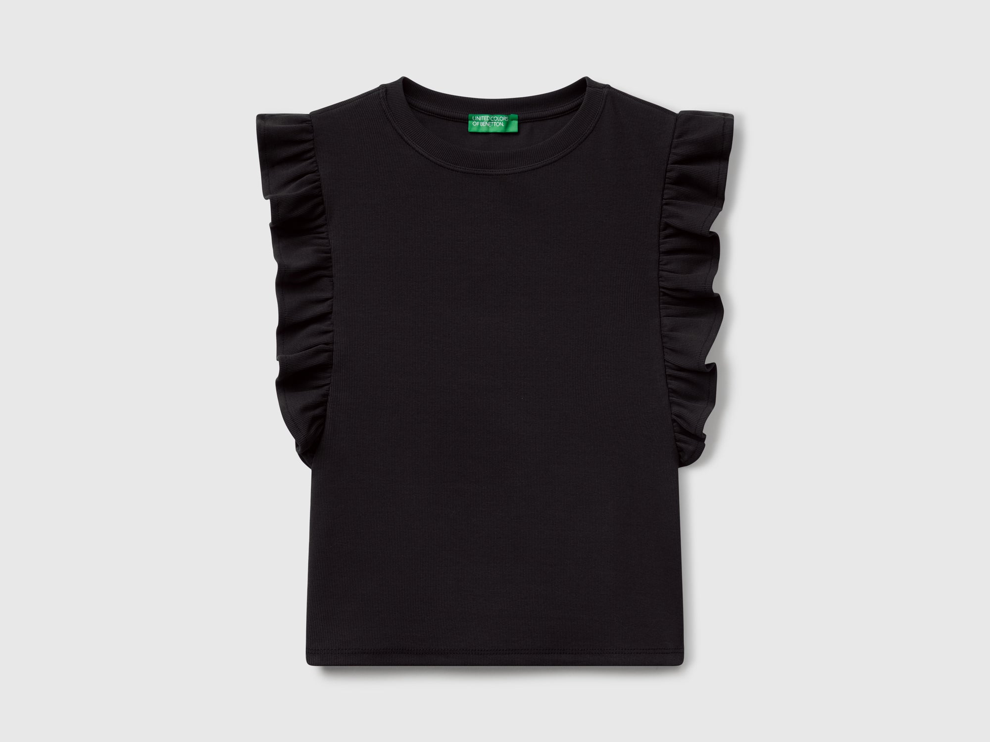 T-shirt girocollo in morbido cotone elasticizzato a costine. Vestibilità aderente e manica corta con rouches. Un capo quotidiano, versatile e super femminile.