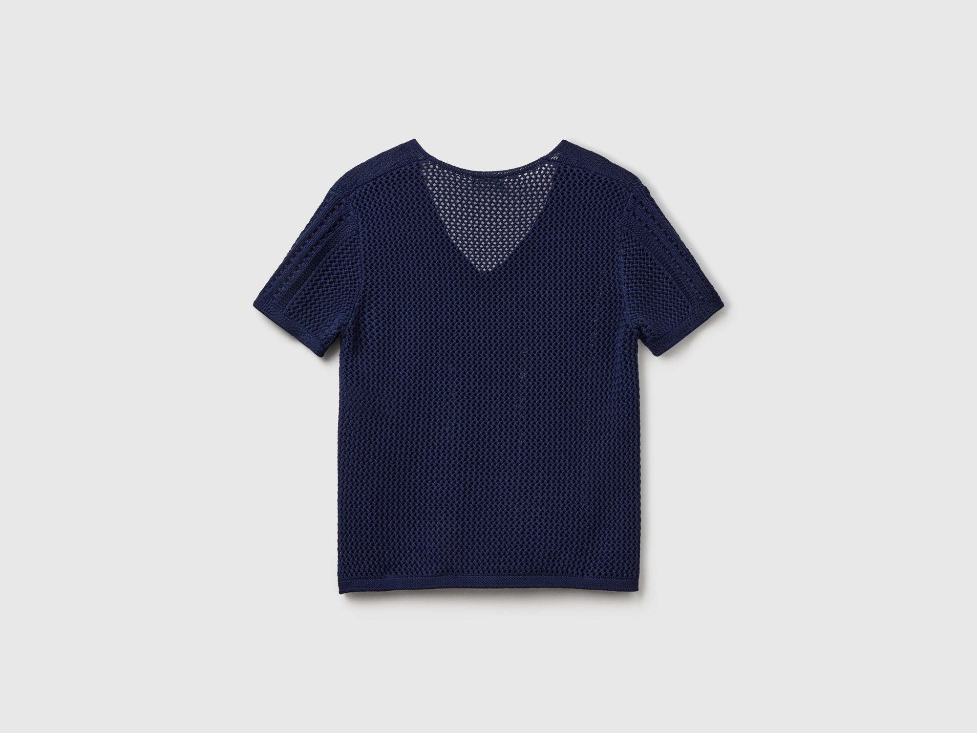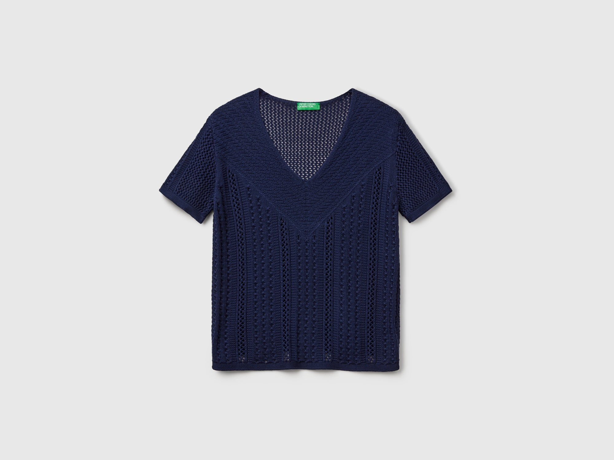 Maglia a manica corta in morbido filato di misto cotone e Modal. Particolare lavorazione con gioco di punti e trafori. Vestibilità regolare con scollo a V. Perfetto anche con un paio di jeans, per look disinvolti e confortevoli.
