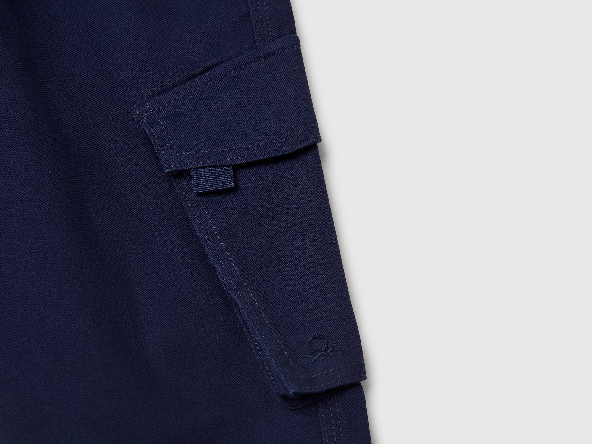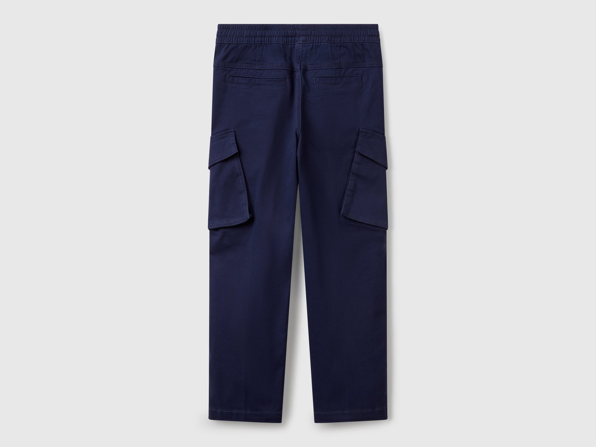 Pantaloni lunghi modello cargo in cotone elasticizzato dalla vestibilità slim. Vita elasticizzata con coulisse, tasche davanti. Look aggiornato con maxi tasche con pattina applicate lateralmente, taschini a filetto sul retro. Da indossare anche con risvolto per un look più moderno.