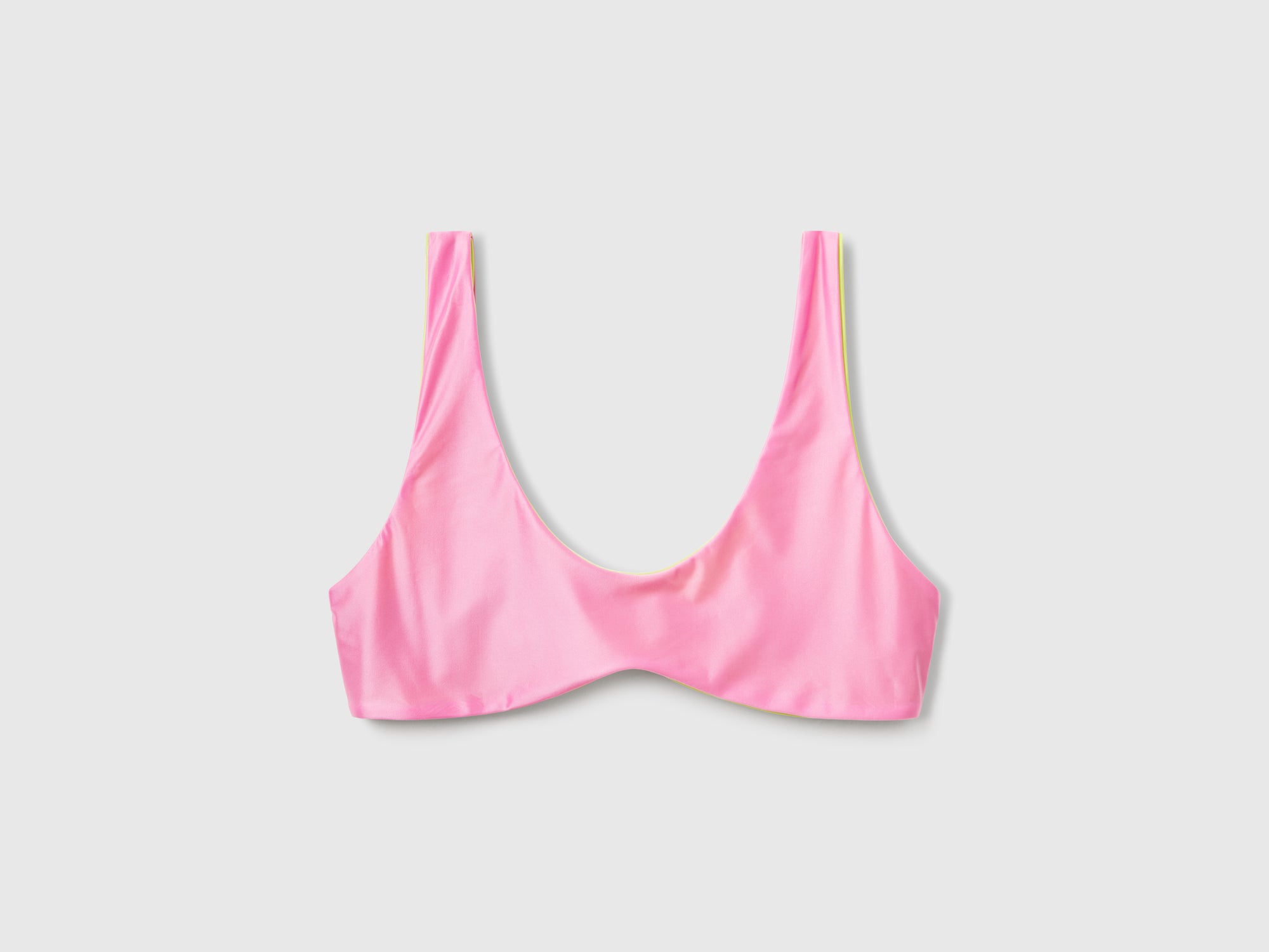 Reggiseno costume a triangolo coppa B elasticizzato, con spalline sottili regolabili e lacci da annodare sulla schiena. Design bicolor reversibile, che permette di avere due capi in uno.