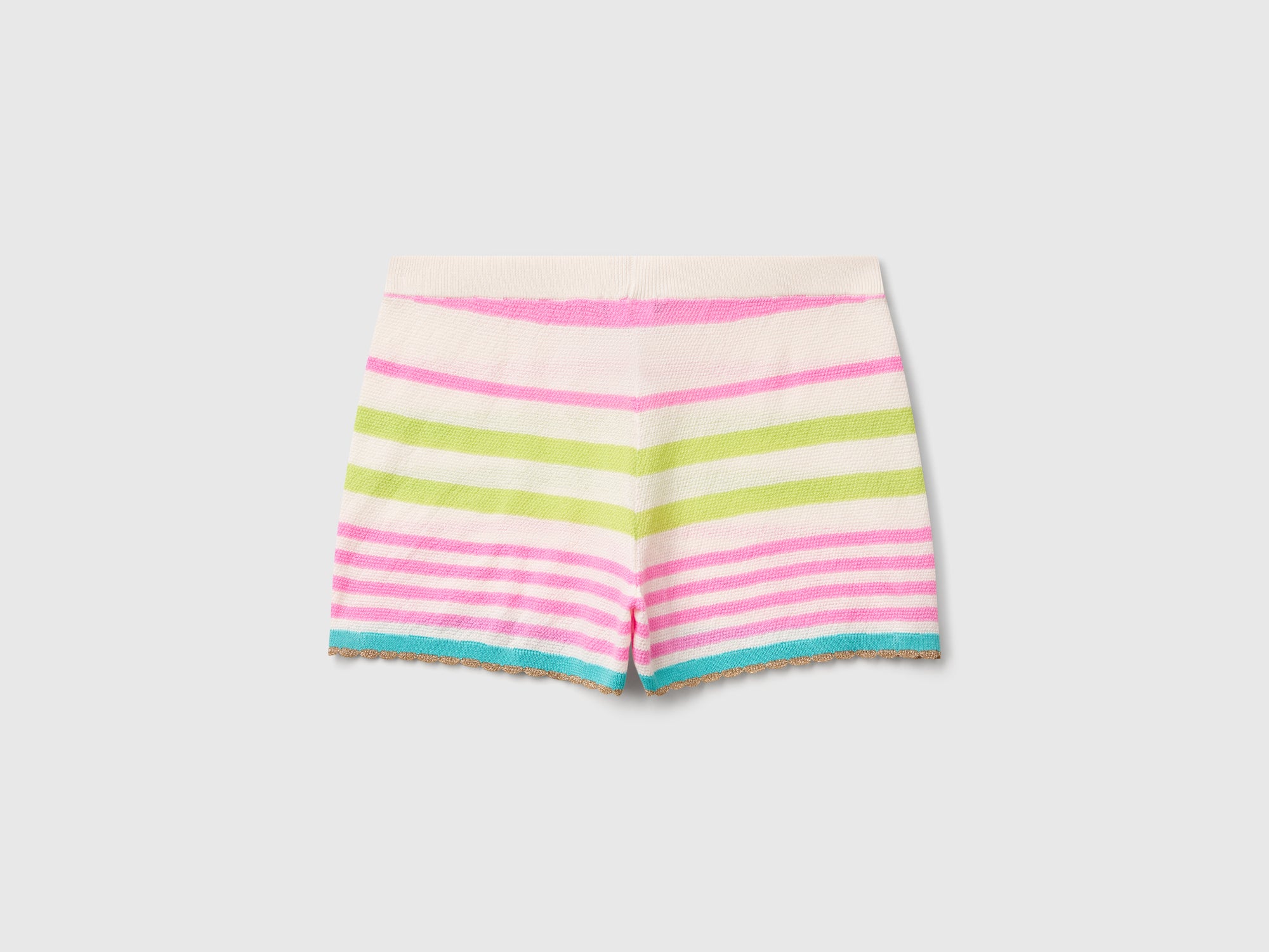 Pantaloni corti copricostume in maglia di puro cotone tricot. Vita elasticizzata, motivo a righe multicolor e bordo ondulato sul fondo.