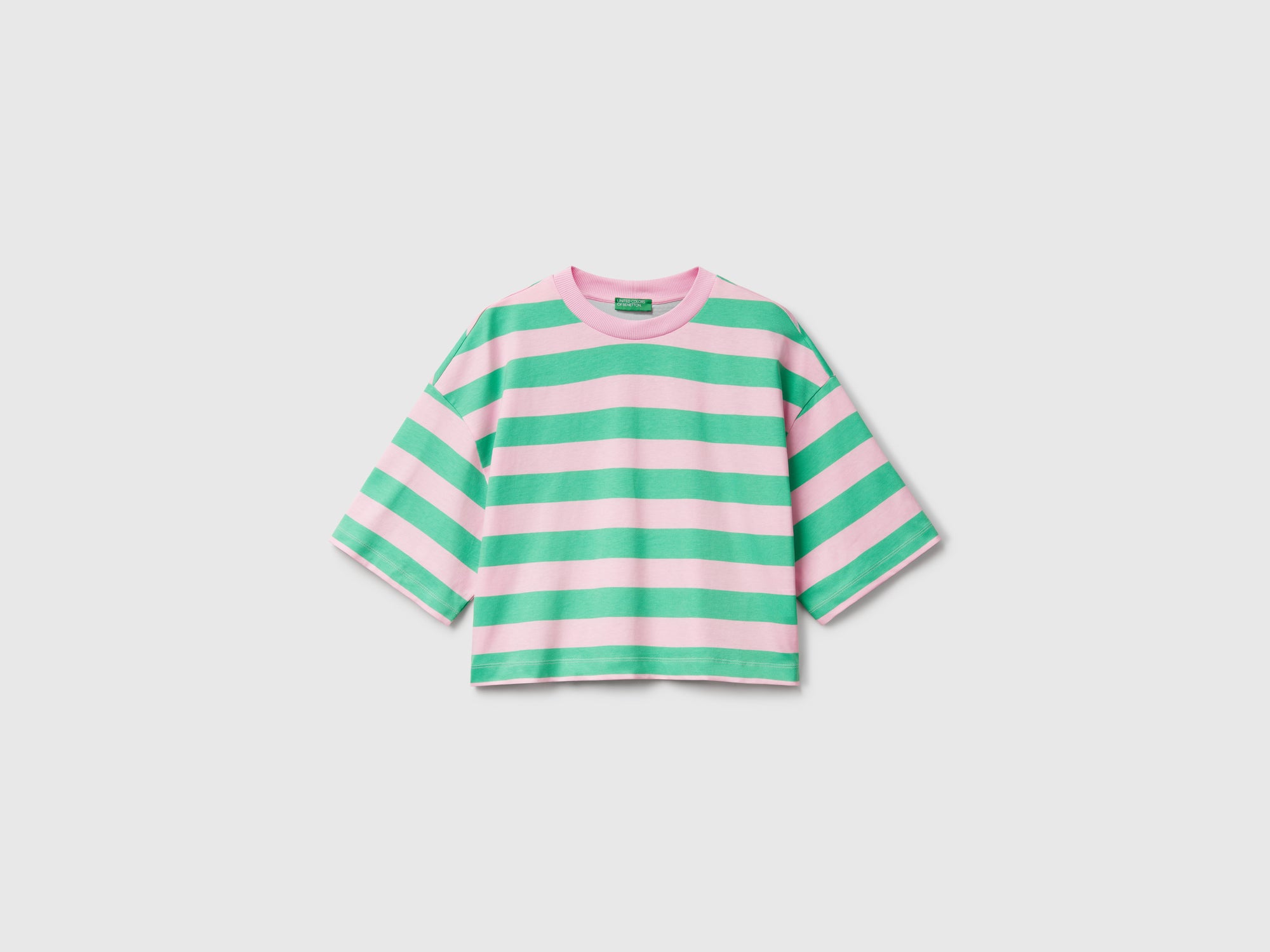 T-shirt girocollo a manica corta in morbido puro cotone. Vestibilità boxy con fantasia a righe bicolor. Stile iconico e piacevolmente casual.