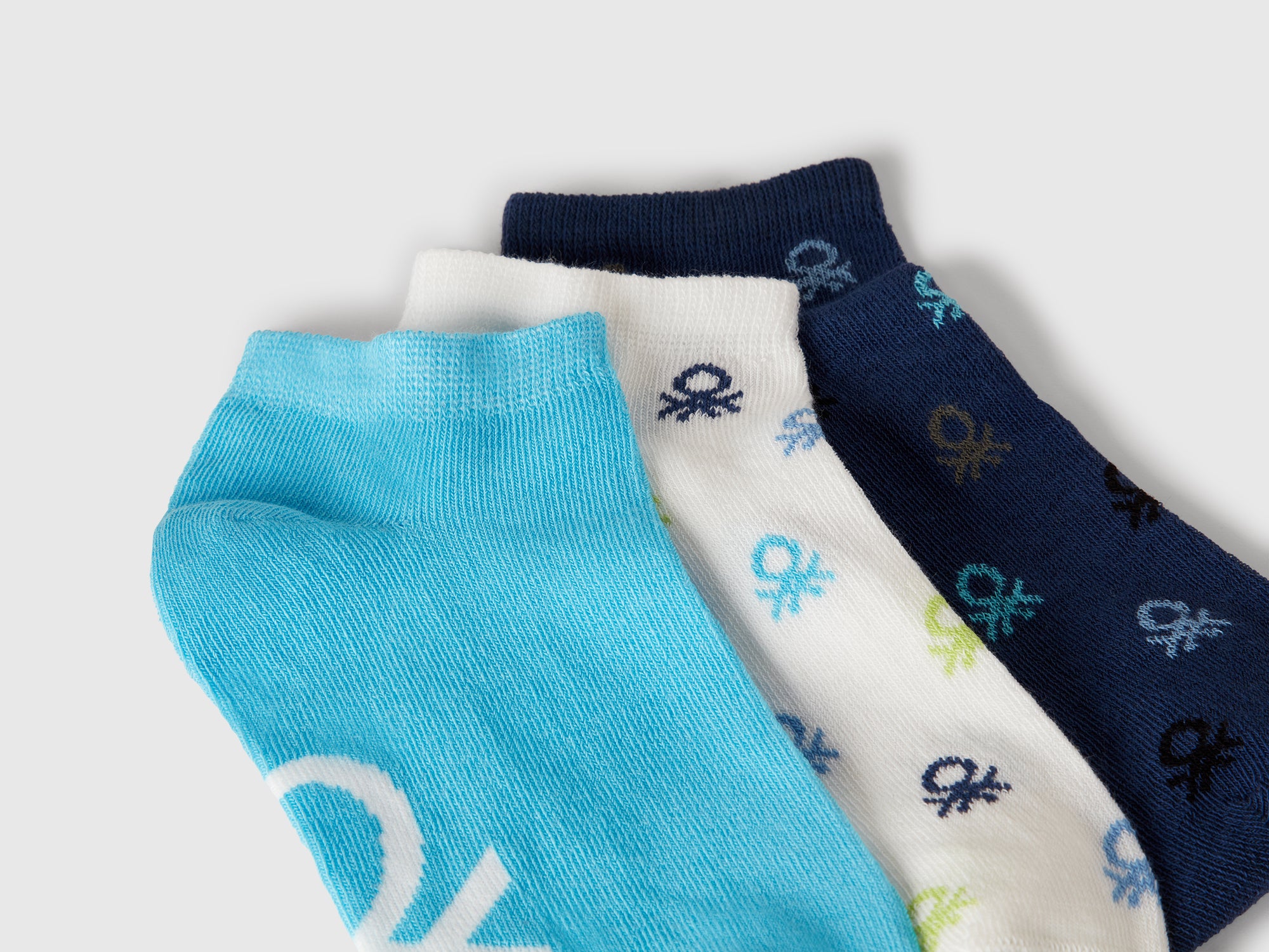 Set comporto da tre paia di calzini corti in misto cotone elasticizzato. Lavorazione jacquard con fantasia loghi.