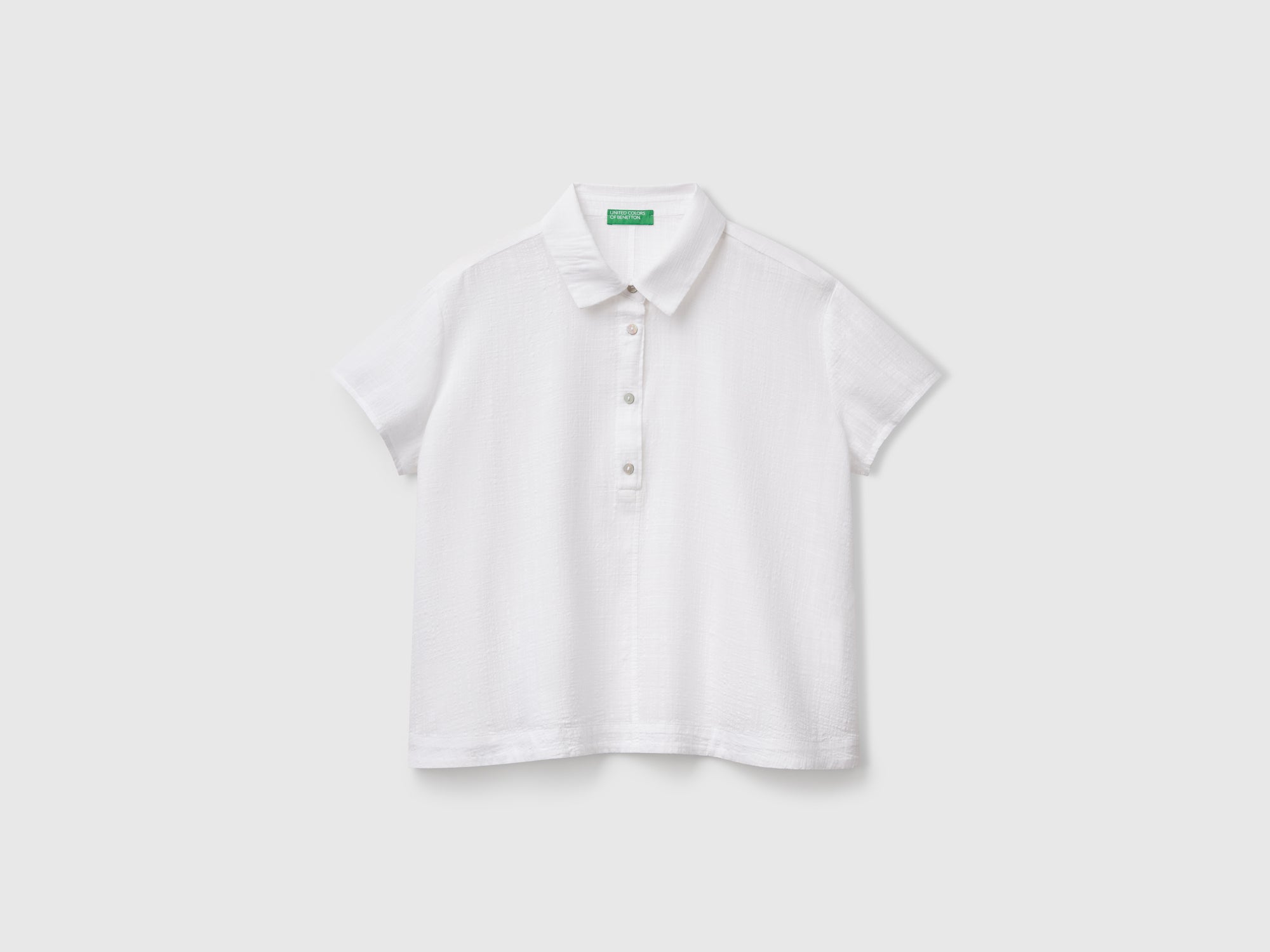 Camicia in tessuto morbido e leggero di misto cotone e viscosa. Colletto a punta, manica corta e abbottonatura parziale sul davanti. Vestibilità rilassata e svasata, perfetta con un paio di jeans.