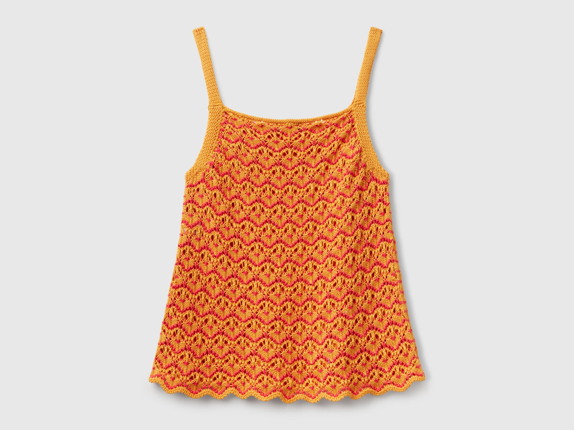 Top a canotta in maglia di puro cotone con lavorazione in punto crochet. Spalline sottili, scollo rotondo e motivo a righe multicolor. Un capo romantico, che si presta anche alle sovrapposizioni.