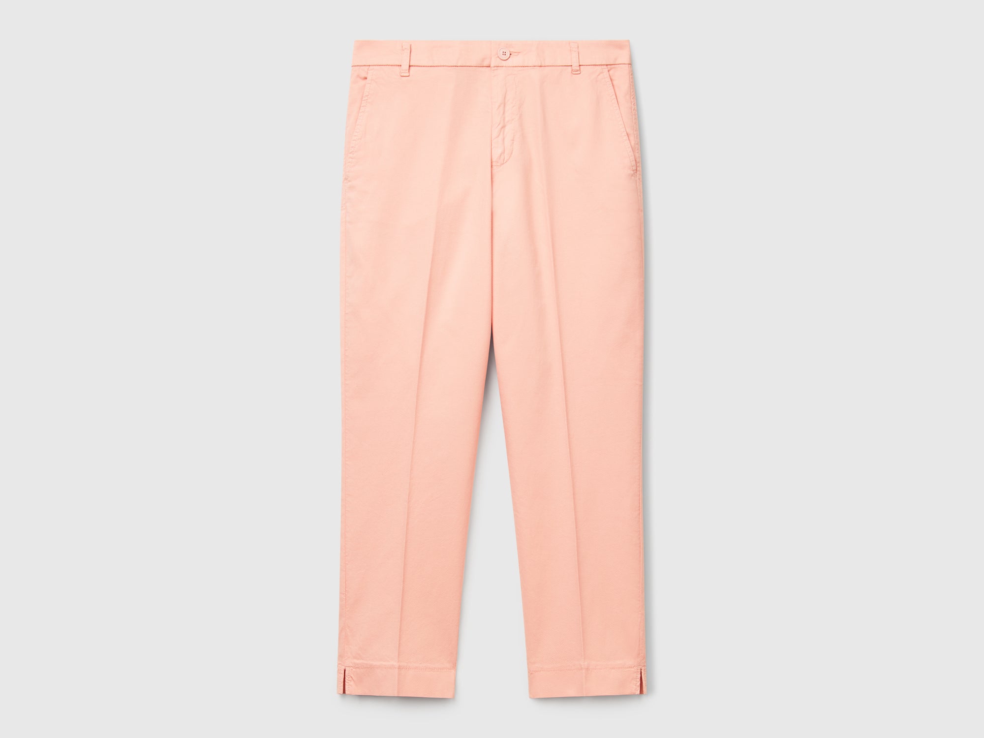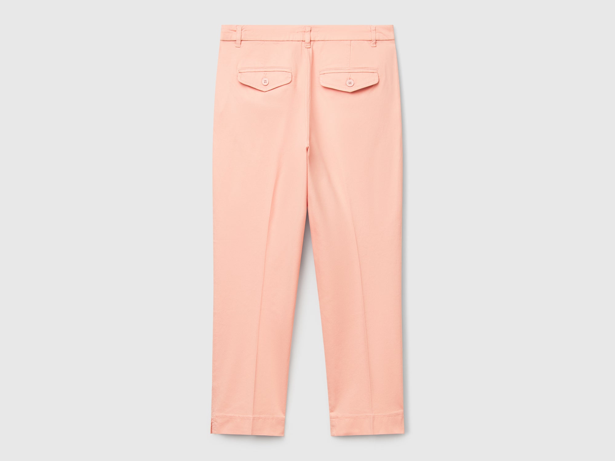 - Características principales: Pantalones chinos largos de algodón elástico con efecto piqué. Corte ajustado y ligeramente cropped con aberturas en la parte inferior de la pernera. Bolsillos delanteros, bolsillos traseros con pinzas y bolsillos de solapa. Sencillos y versátiles, ideales para ocasiones más formales, ya sea con zapatillas o tacones. Algodón elástico con efecto piqué; Trabillas para cinturón; Cierre de cremallera y botón; Herrajes metálicos sin níquel.