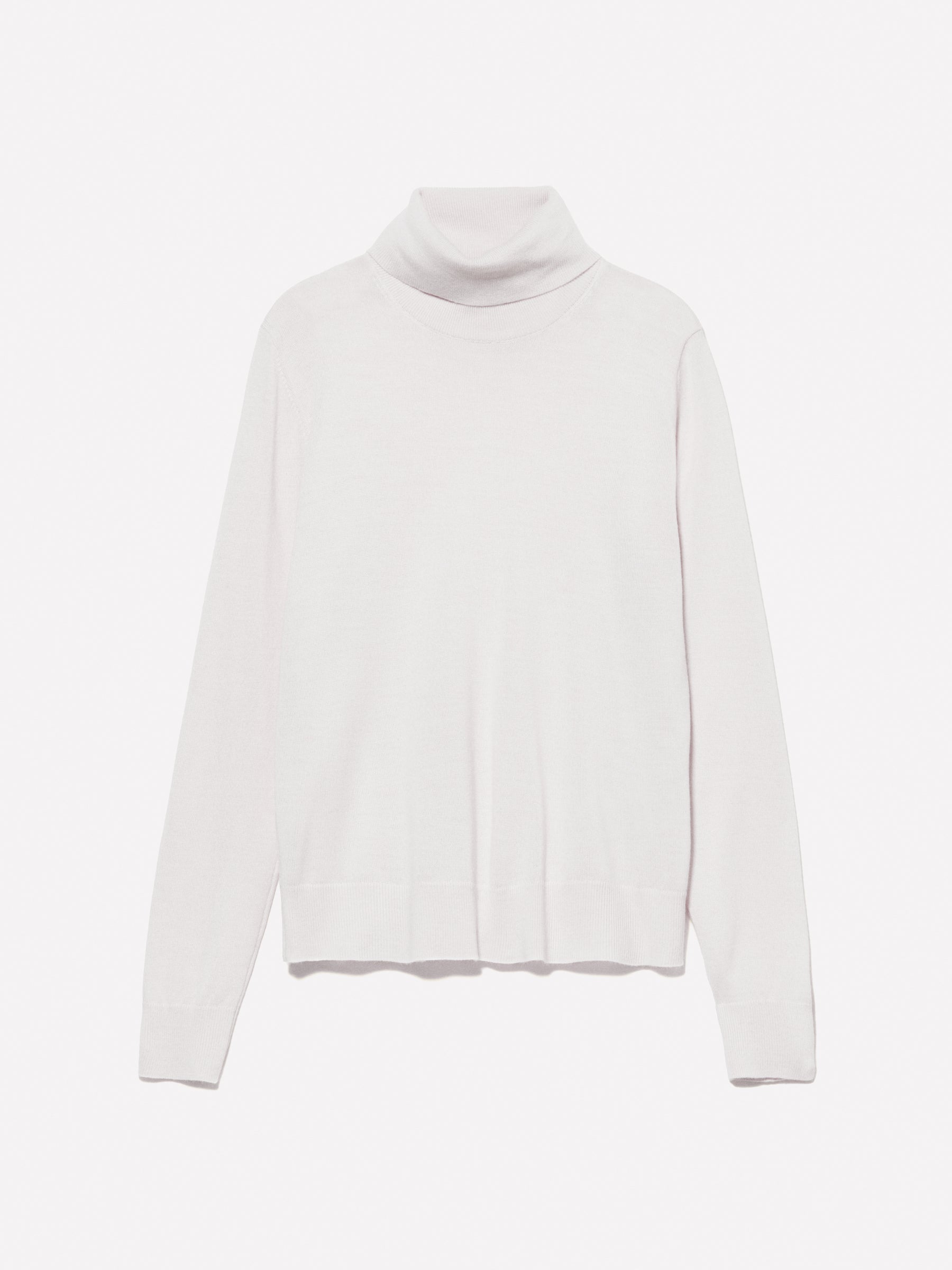 Maglia dolcevita bianco panna in misto lana, con collo alto a costine e maniche lunghe.