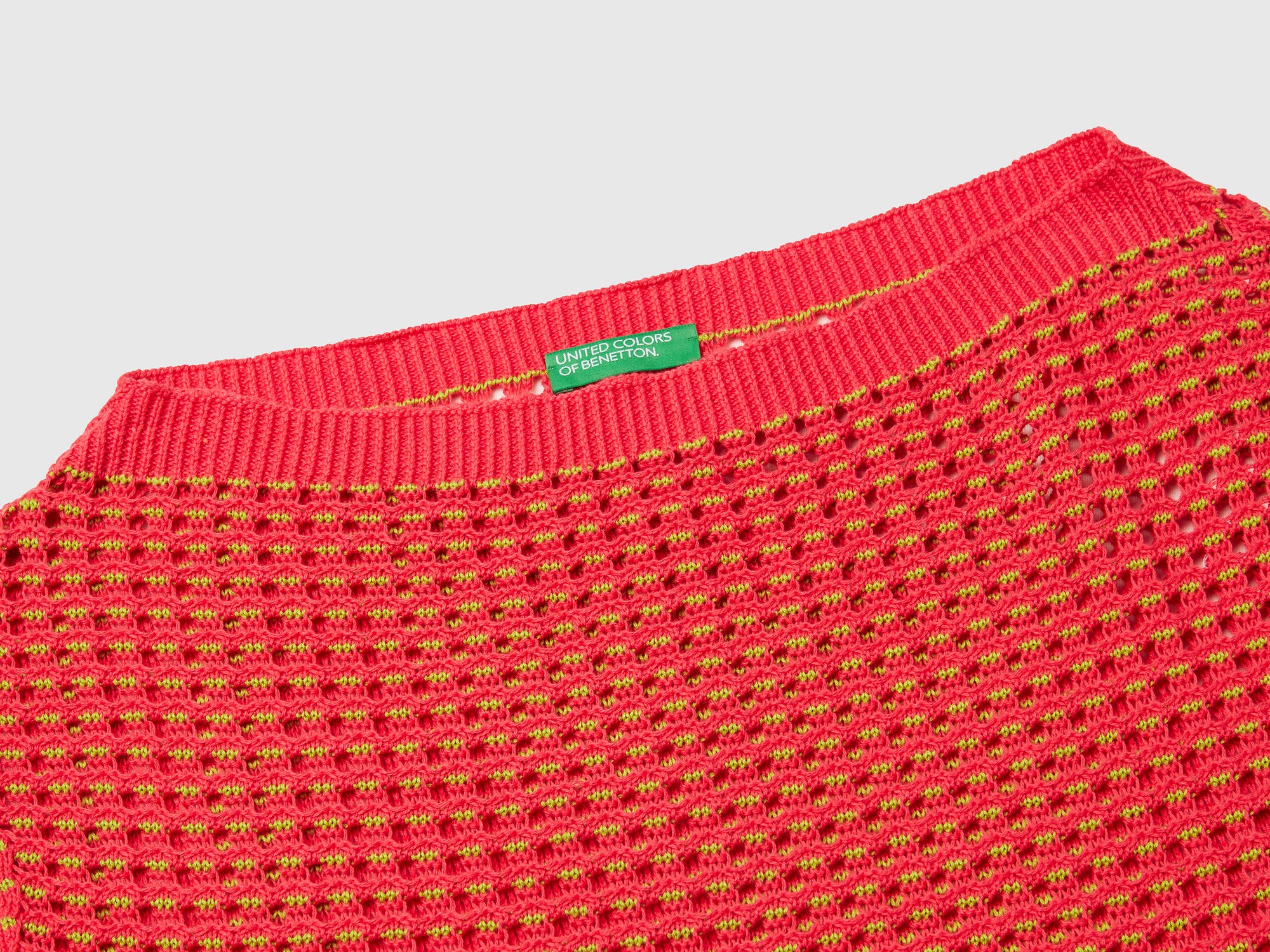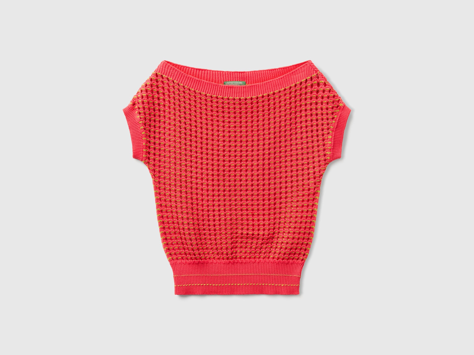 Suéter de algodón puro con cuello barco y manga corta. Costuras especiales de crochet y corte holgado. Una prenda fresca y ligera con un toque romántico. 100 % algodón; dobladillo acanalado.