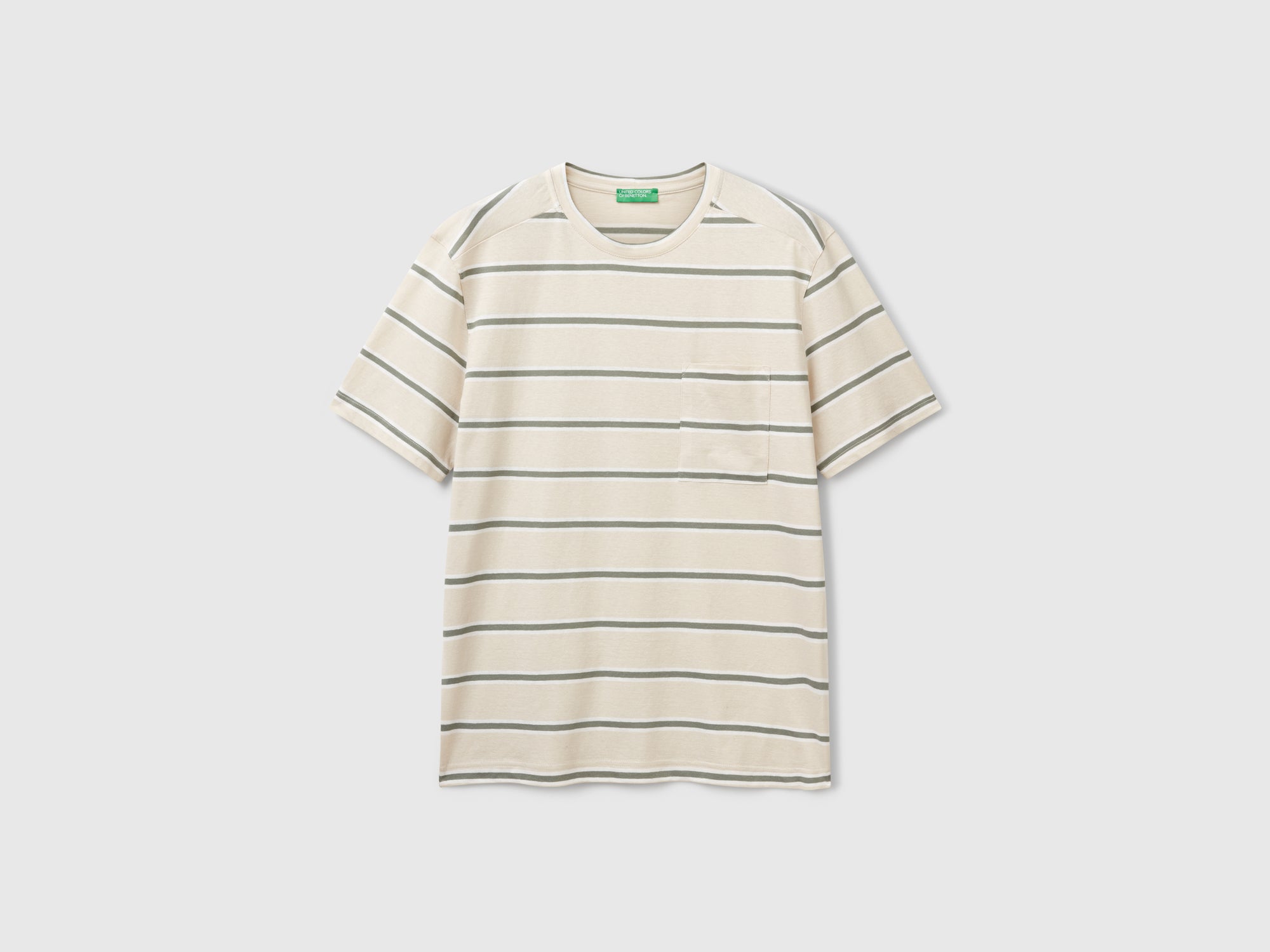 T-shirt in tessuto leggero di misto cotone e lino a righe tinto filo. Scollo rotondo, manica corta e taschino applicato lato cuore. Design contemporaneo e dna cittadino.