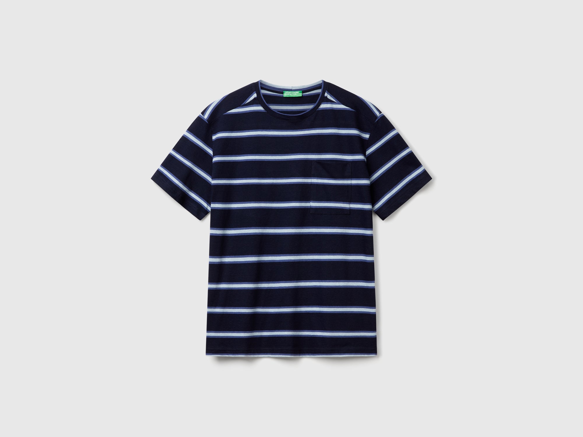 T-shirt in tessuto leggero di misto cotone e lino a righe tinto filo. Scollo rotondo, manica corta e taschino applicato lato cuore. Design contemporaneo e dna cittadino.