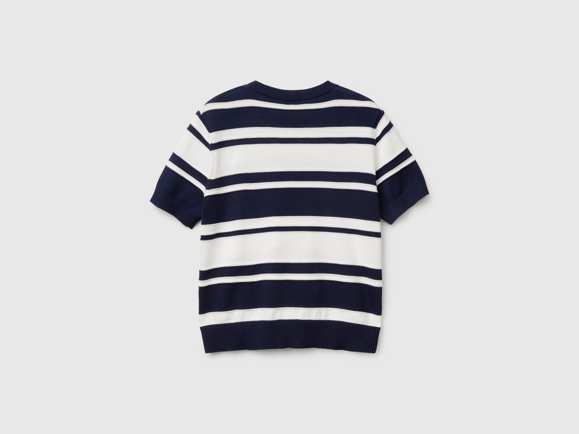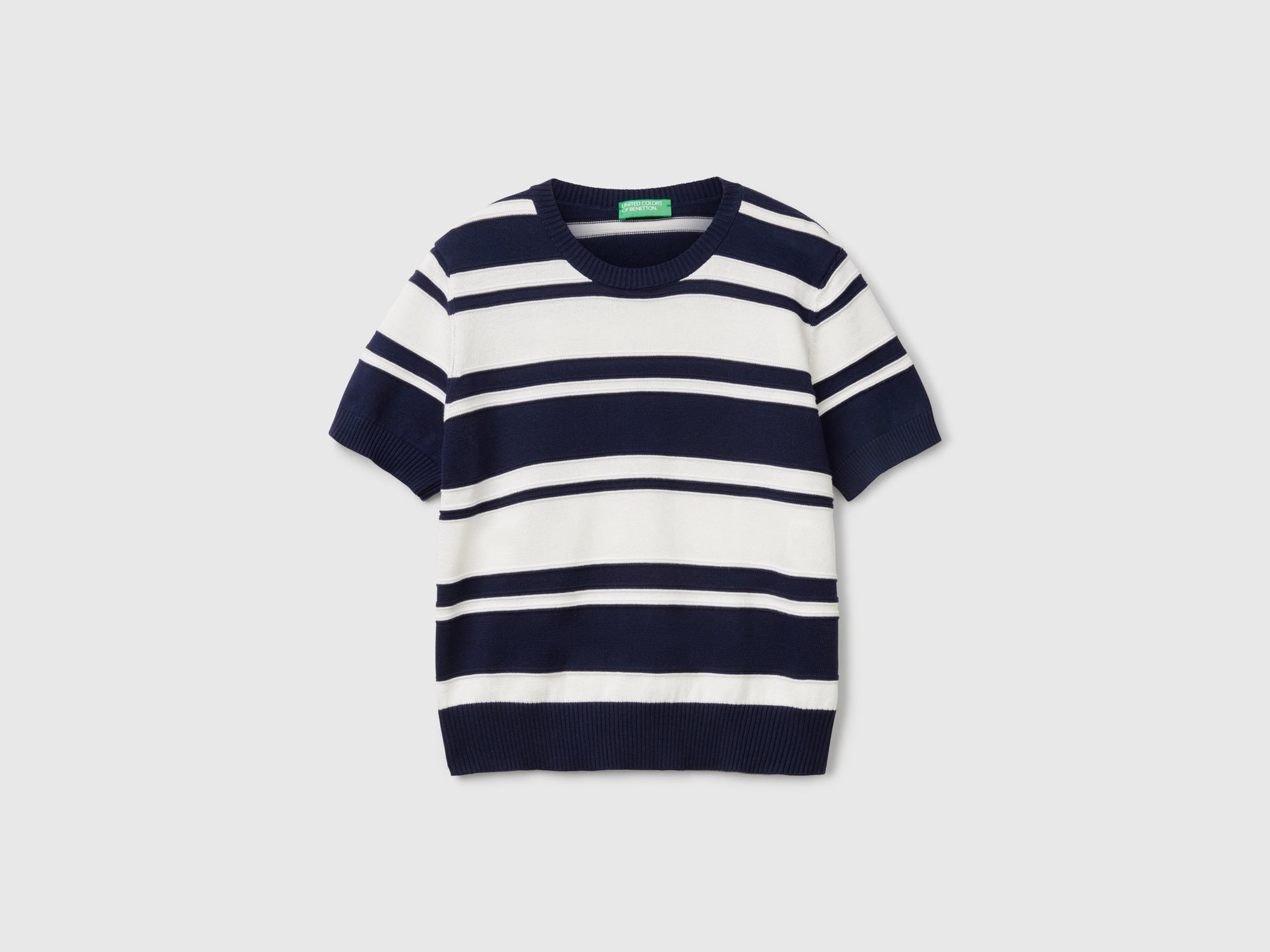 - Características principales: Suéter de cuello redondo y manga corta en suave algodón puro. Estampado de rayas bicolor teñidas en hilo. Estilo colorido y contemporáneo, perfecto para combinar con vaqueros. 100 % algodón; punto liso; bordes acanalados.