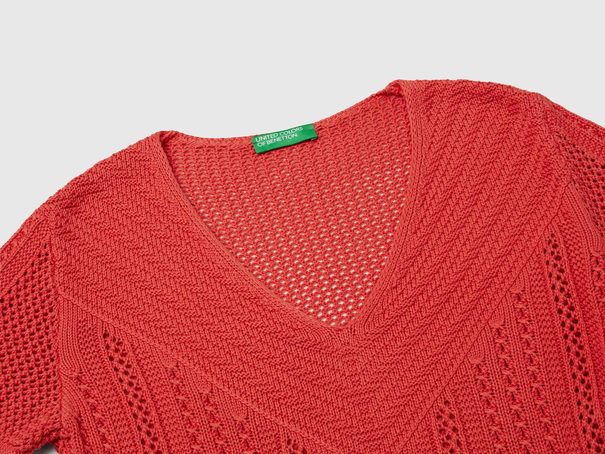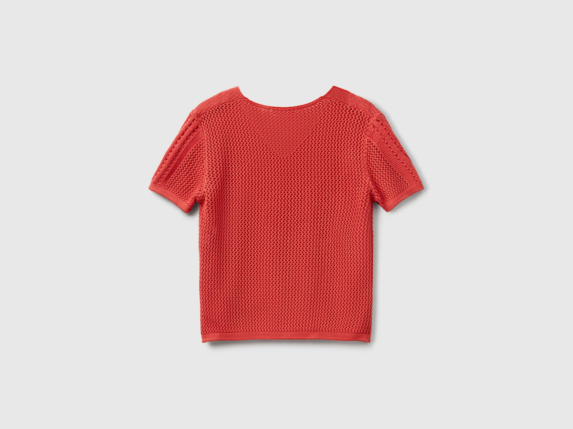 Maglia a manica corta in morbido filato di misto cotone e Modal. Particolare lavorazione con gioco di punti e trafori. Vestibilità regolare con scollo a V. Perfetto anche con un paio di jeans, per look disinvolti e confortevoli.