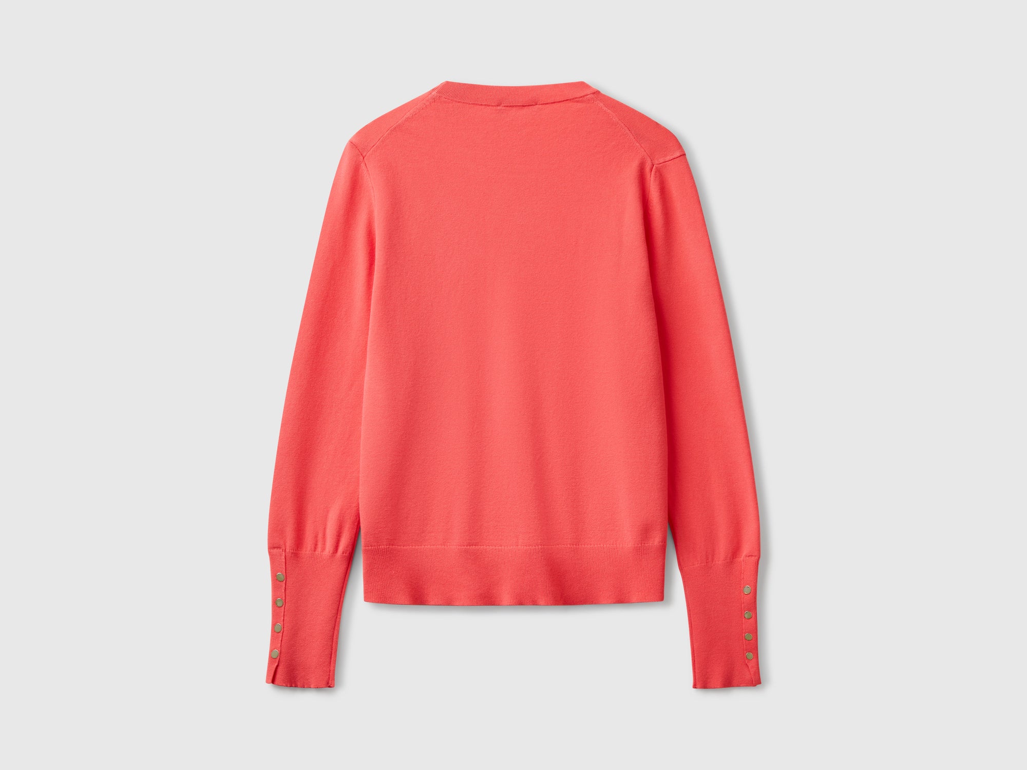 - Características principales: Suéter de cuello redondo en suave mezcla de viscosa. Corte ajustado y mangas largas con botones decorativos en el bajo. Para un look casual-chic que siempre está a la moda. Mezcla de viscosa; Punto recto; Bordes acanalados.