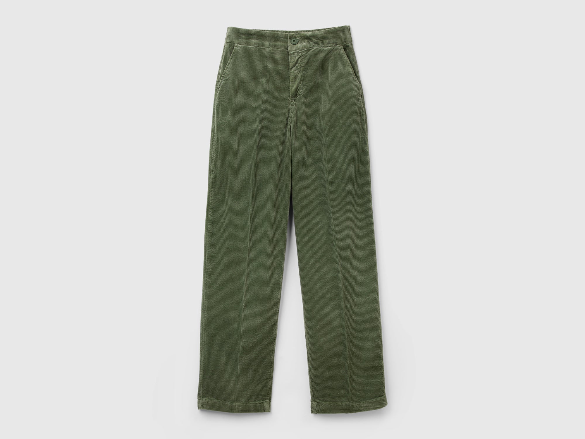 Pantalones largos de terciopelo de algodón elástico con rayas finas. Pierna recta con pliegue central planchado delante y detrás. Cintura con abertura de cremallera y botón. Cómodos y femeninos, para llevar a la oficina y para los compromisos diarios.