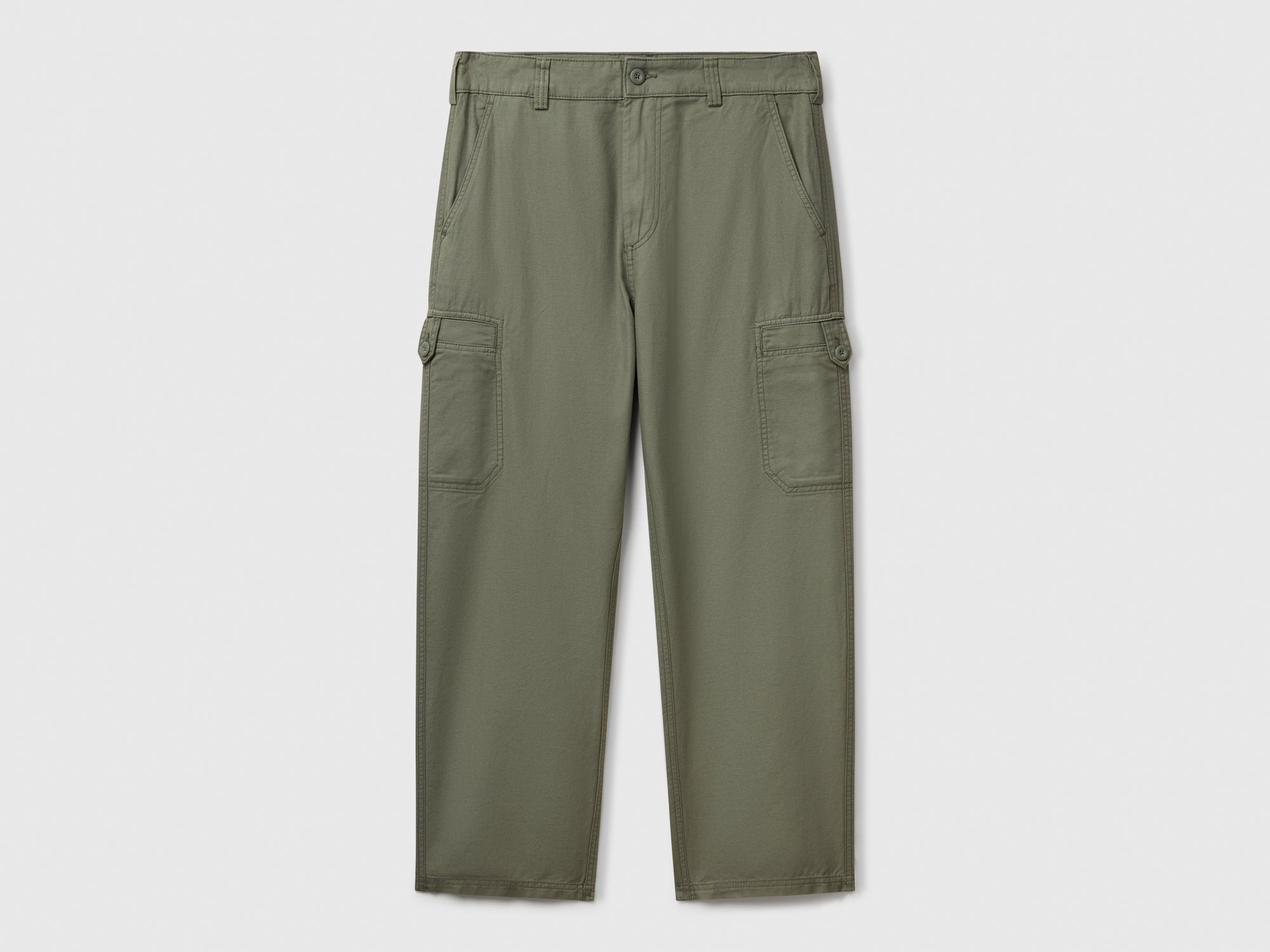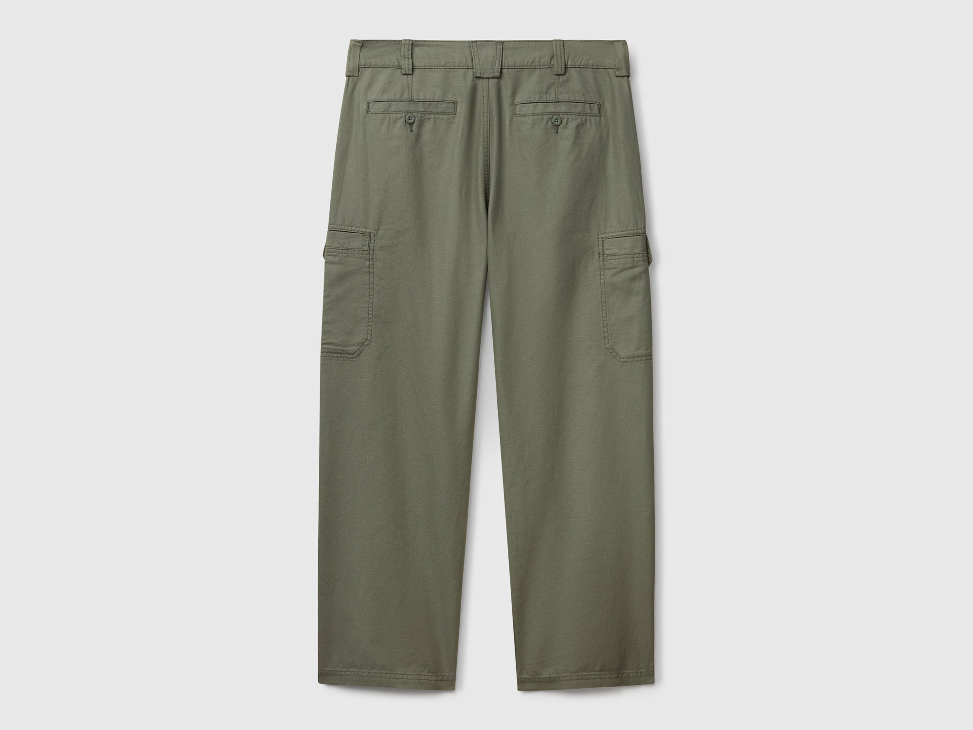 Pantaloni lunghi modello cargo in morbido tessuto di misto cotone e lino. Vestibilità regolare con gamba dritta, taschini a filetto sul fianco con alamaro. Apertura frontale a zip e bottone, tasche davanti e taschini a filetto sul retro. Comodi, moderni e originali.