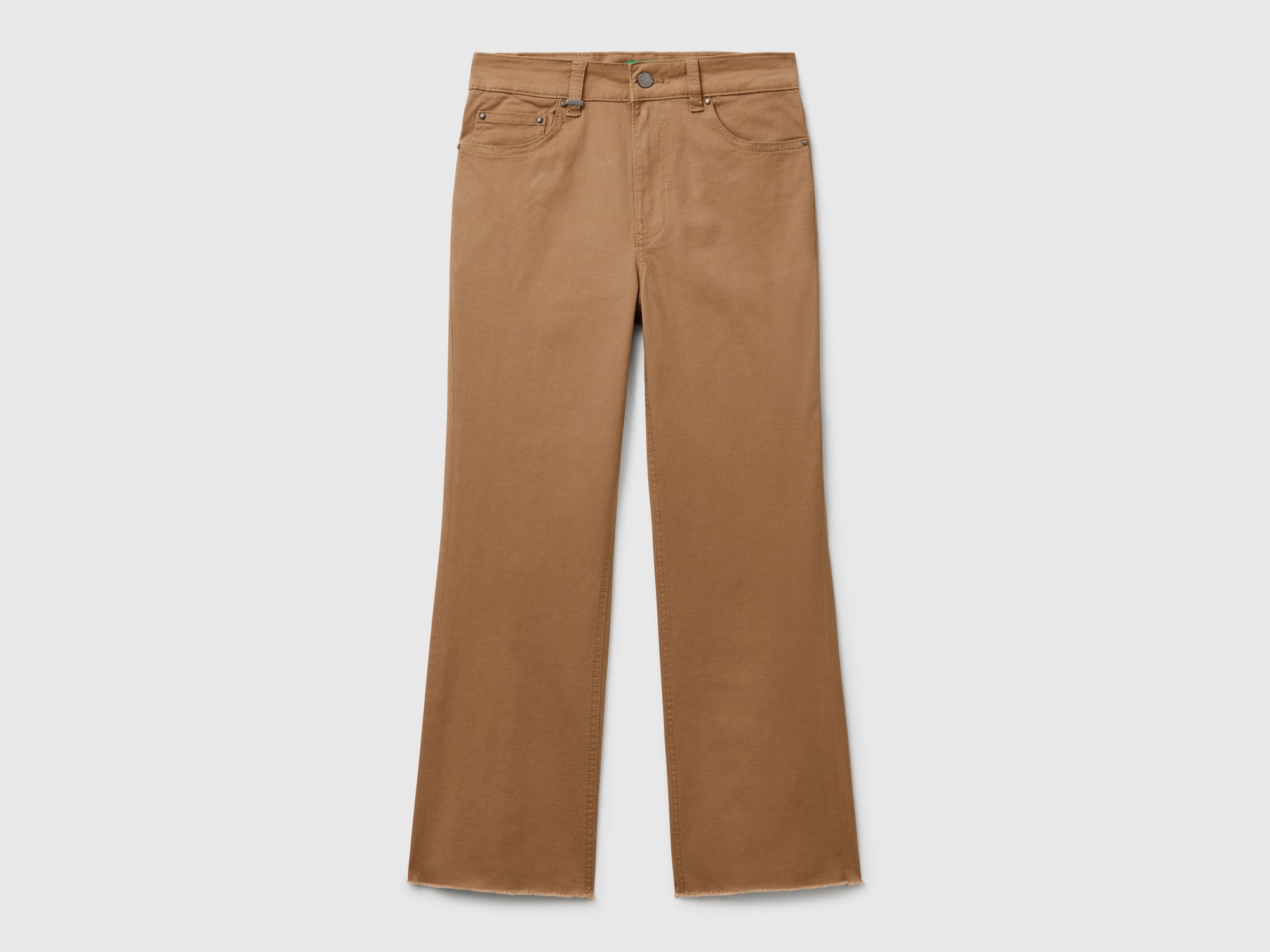 - Características principales: Pantalones de corte trompeta de algodón elástico con bajos sin rematar. Cinco bolsillos, corte por encima del tobillo, pernera más estrecha en el muslo y bajo acampanado. Para un look moderno y actual. Gabardina de algodón elástico; Cierre de cremallera y botón; Trabillas para cinturón; Canesú trasero; Herrajes sin níquel.