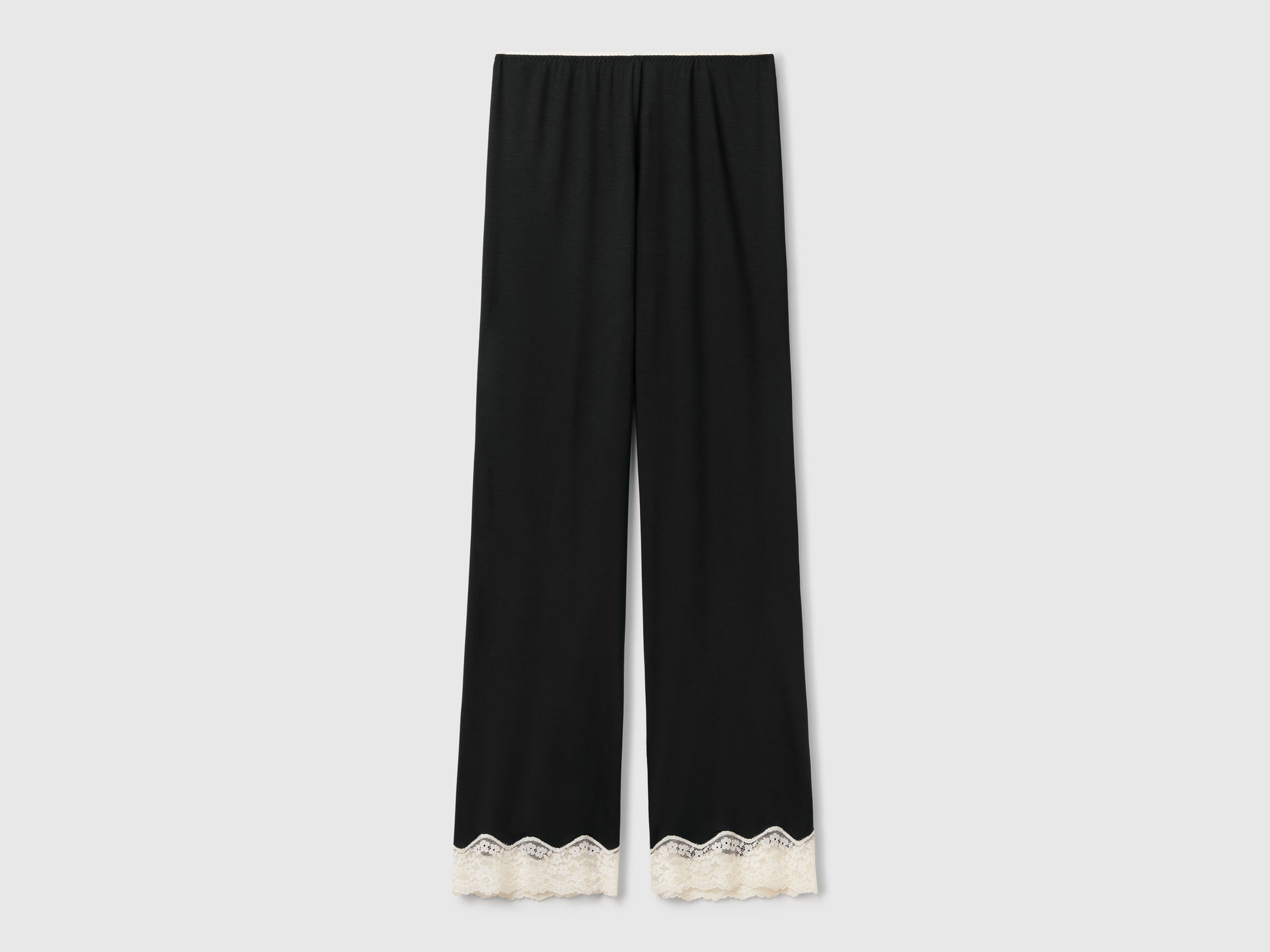 - Características principales: Pantalón de pijama largo de viscosa elástica suave. Cómoda cinturilla elástica y detalle de encaje en contraste en la parte inferior de las piernas. Este producto contiene al menos un 30 % de fibras de viscosa LENZING™ ECOVERO™ procedentes de bosques controlados o certificados. LENZING™ y ECOVERO™ son marcas registradas de Lenzing AG. Jersey de viscosa elástica.