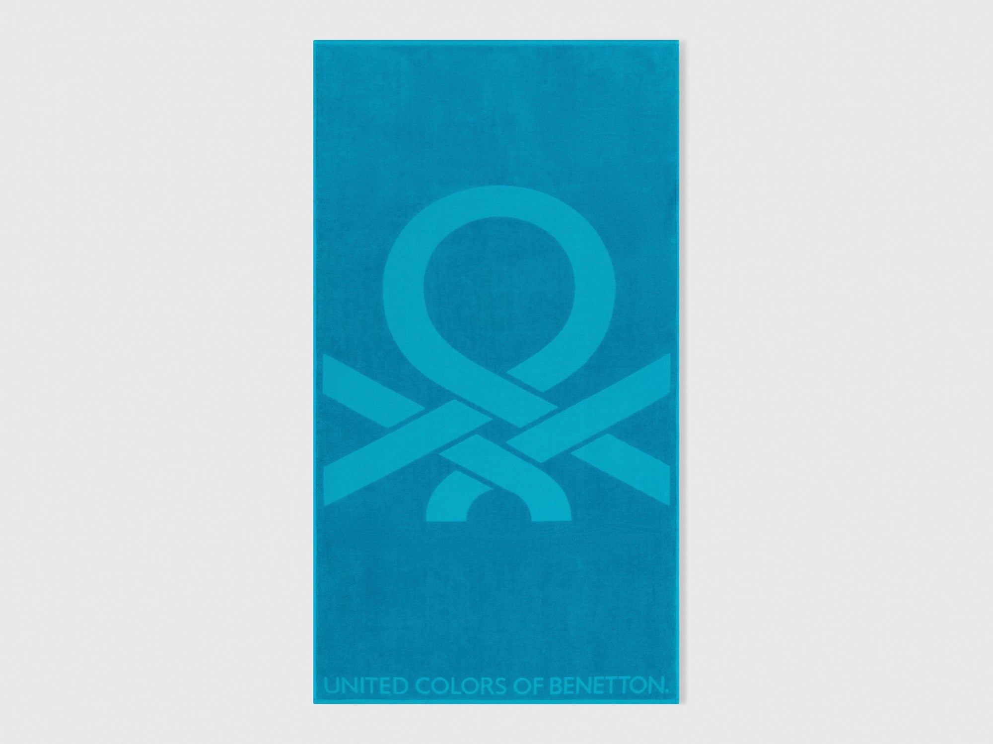 Telo mare in morbida spugna di puro cotone tinta unita. Maxi logo jacquard su un lato.