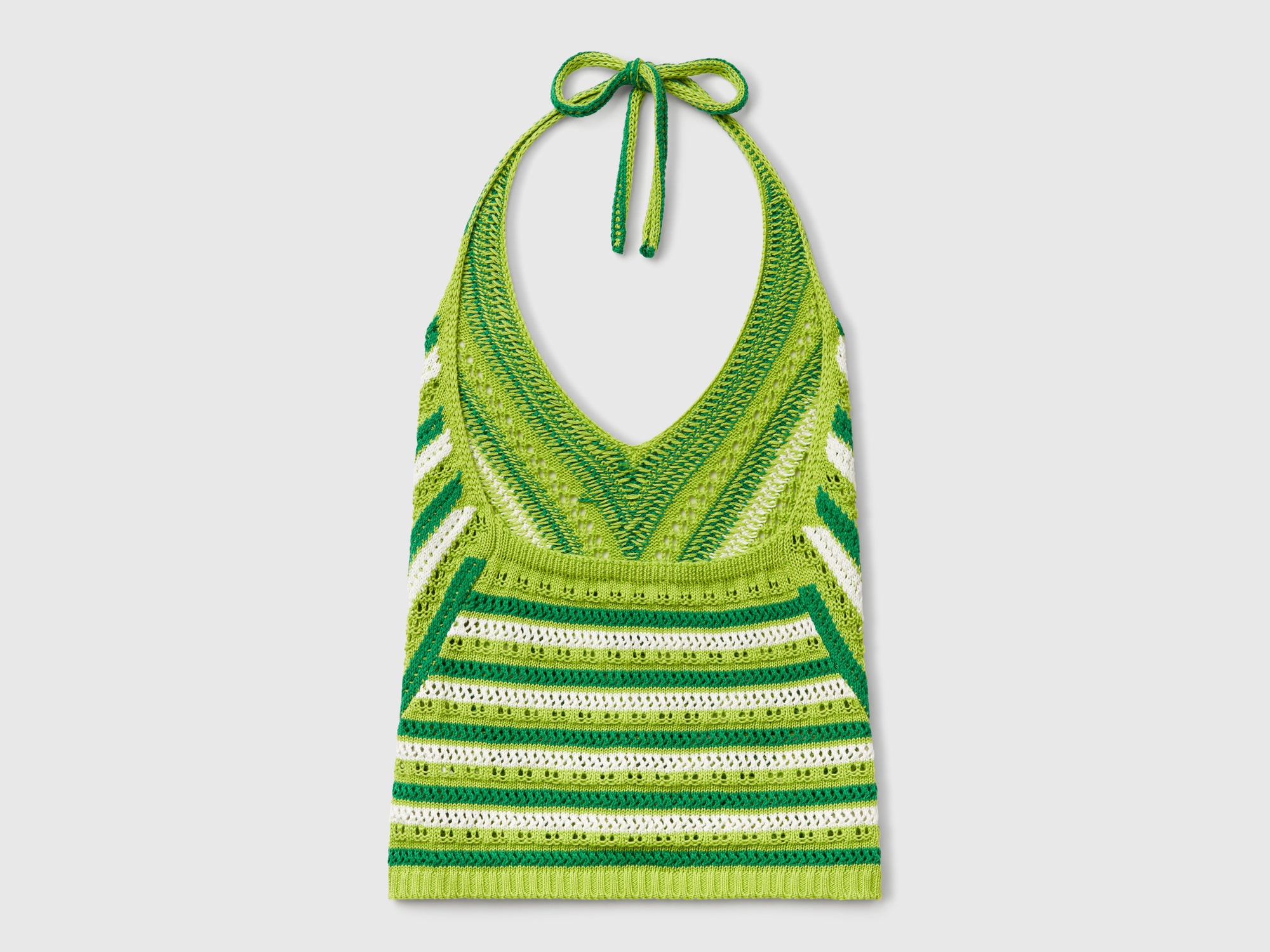 Top in morbida maglia di misto cotone riciclato con lavorazione in punto crochet. Scollo a V con lacci da annodare dietro il collo. Motivo a righe multicolor, per un capo leggero e romantico. Articolo realizzato con materiale contenente almeno il 20% di cotone riciclato.