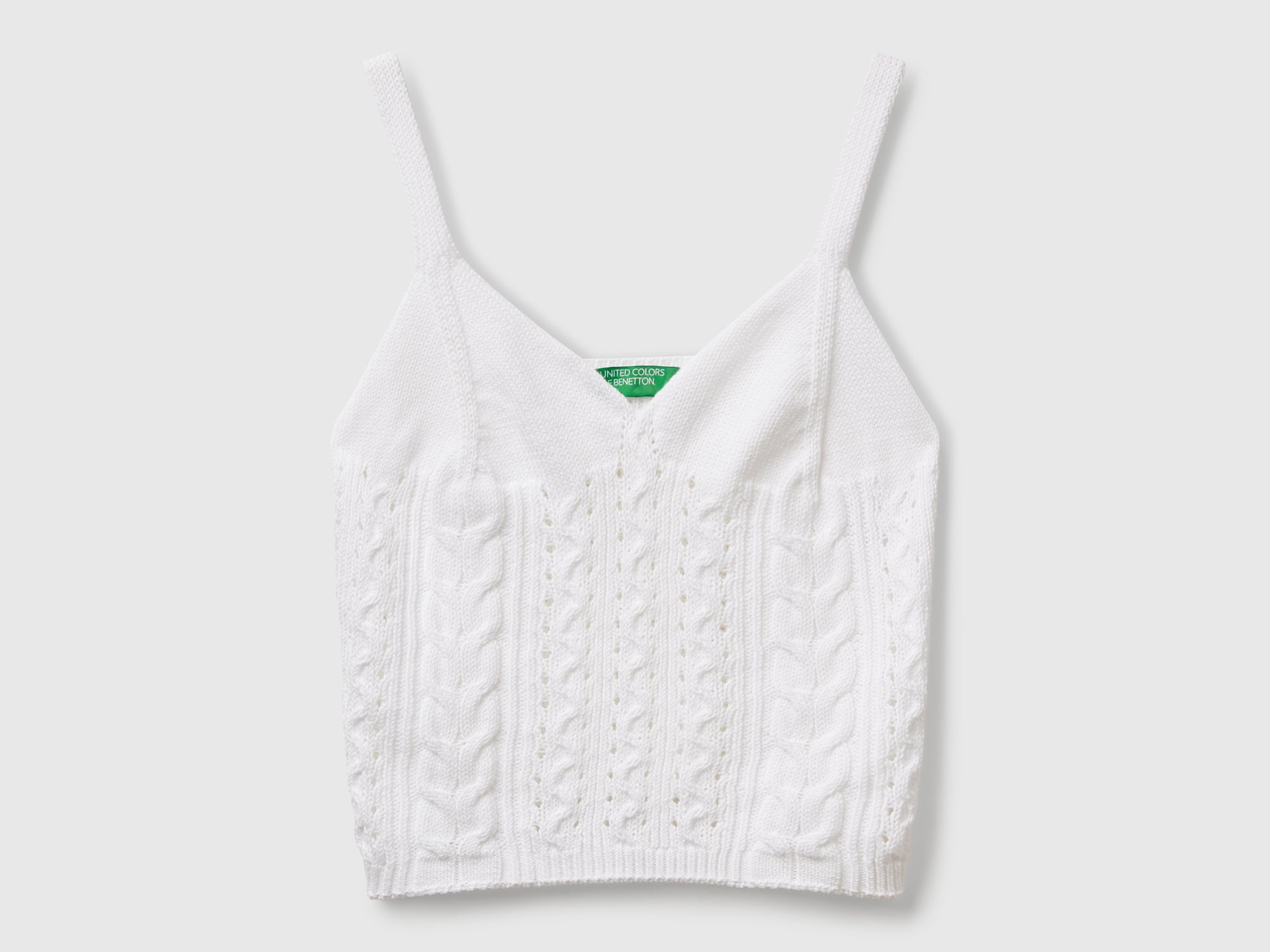 Top in maglia di puro cotone con lavorazione in punto crochet. Spalline regolari e scollo a V. Per look cool e leggeri, dal gusto romantico.
