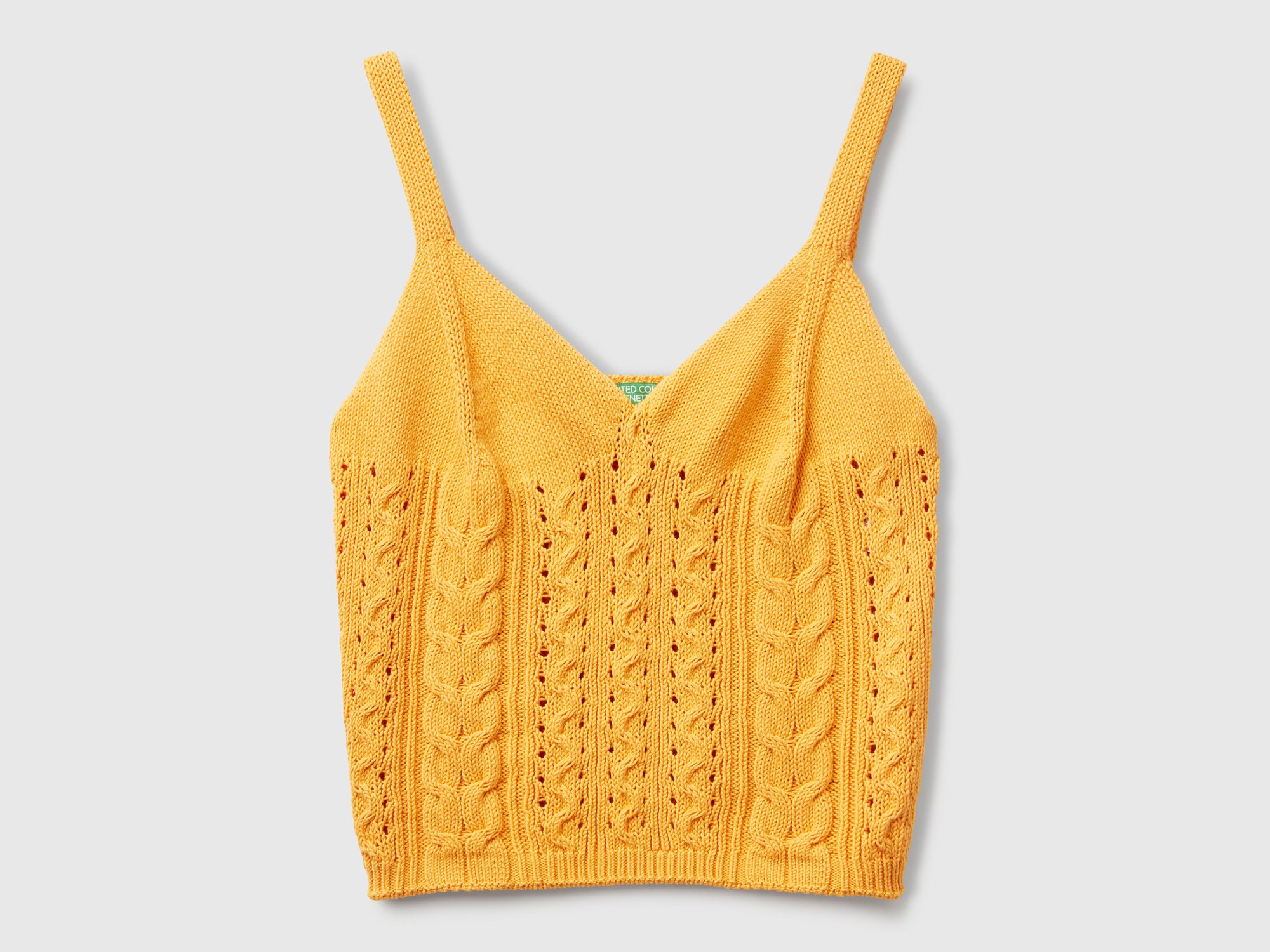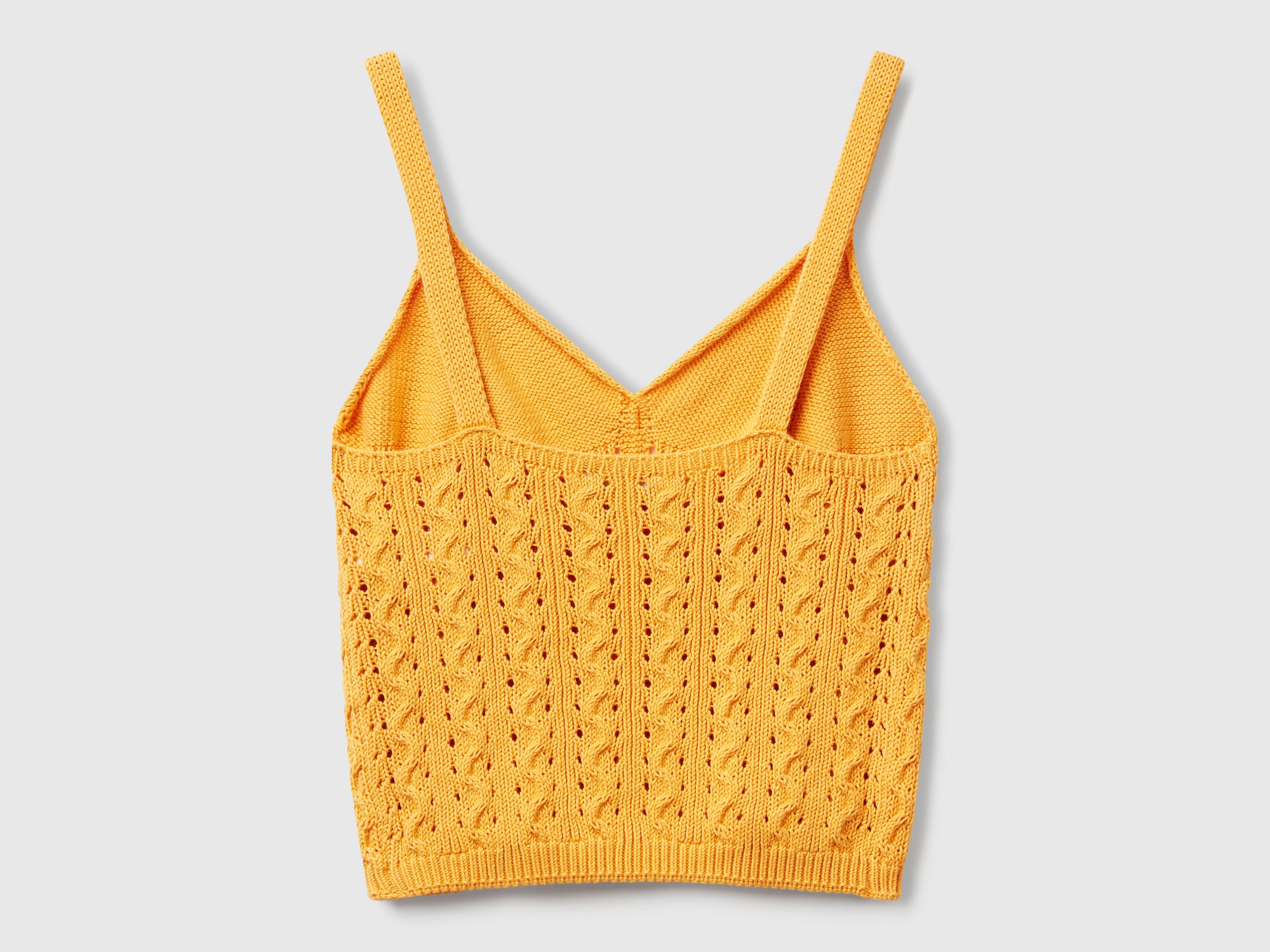 Top in maglia di puro cotone con lavorazione in punto crochet. Spalline regolari e scollo a V. Per look cool e leggeri, dal gusto romantico.