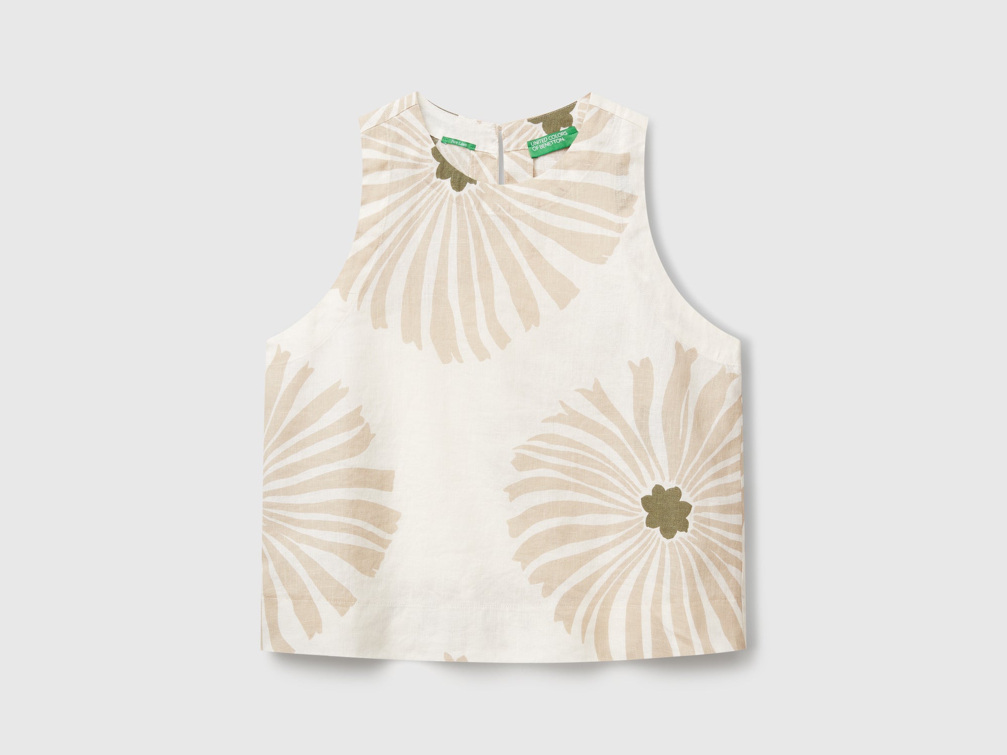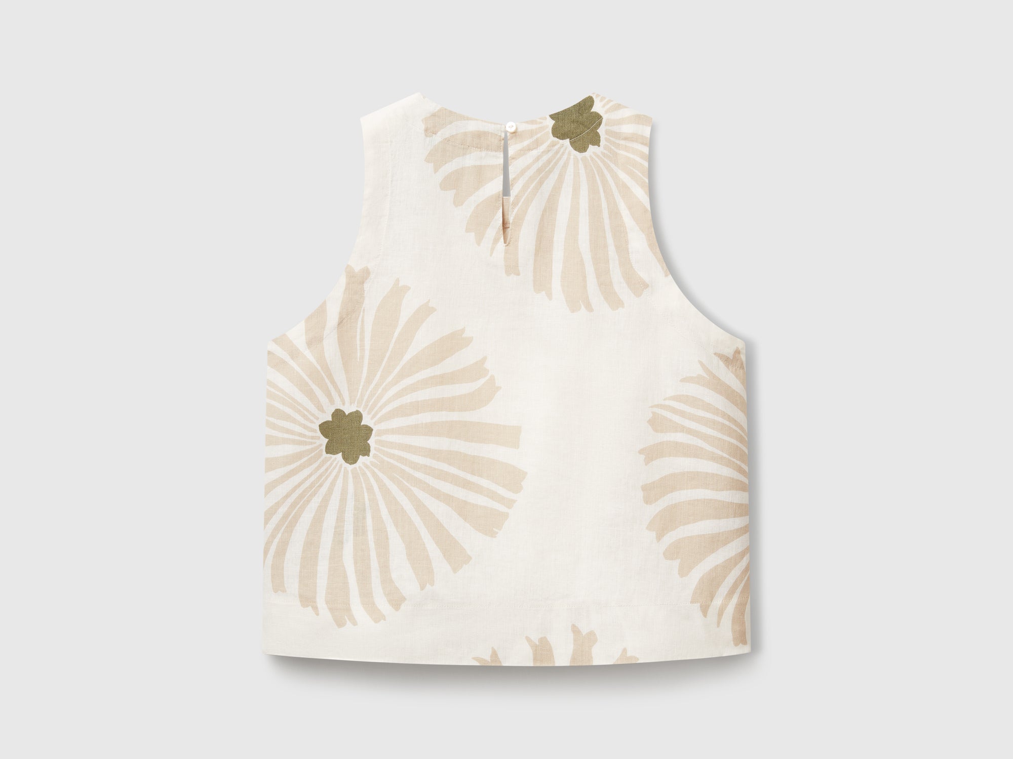 Canotta dal taglio svasato con scollo rotondo e apertura a goccia con bottoncino sul retro. Stampa fantasia su tutto il capo. Articolo realizzato con materiale in 100% lino coltivato in Europa.