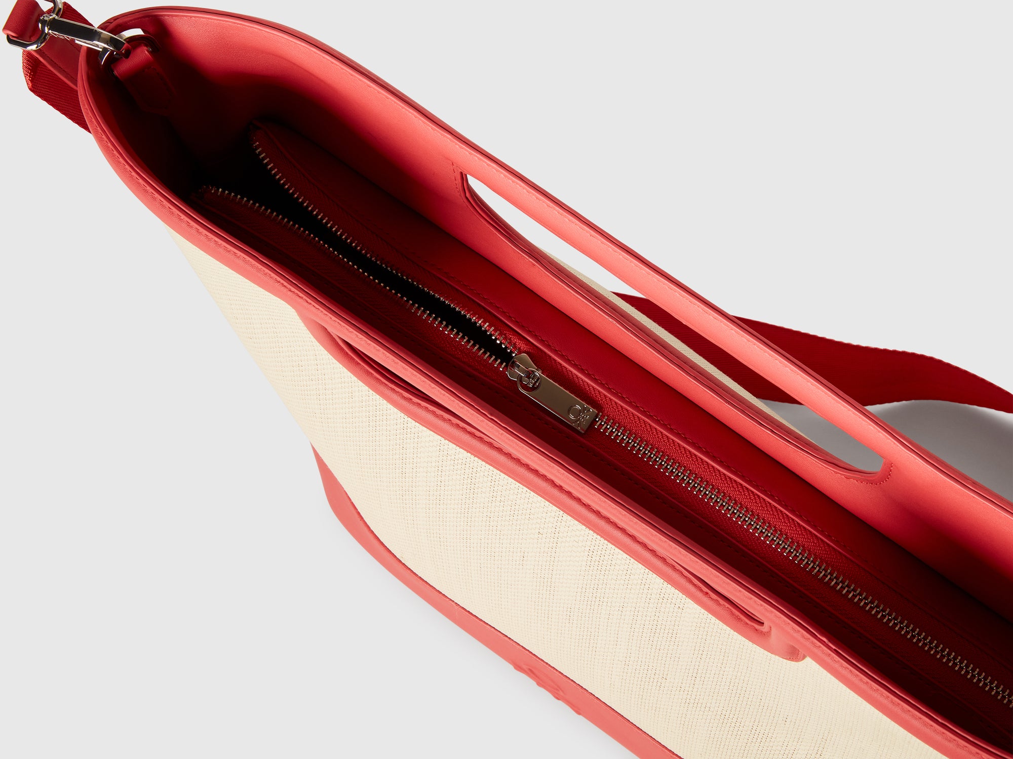 Borsa grande rettangolare in tessuto effetto rafia con inserti in tessuto spalmato. Pratici doppi manici e tracolla regolabile e rimovibile in tessuto jacquard. Chiusura a zip e logo in rilievo sul fondo. Un accessorio trendy, funzionale e femminile, da sfoggiare nella bella stagione.