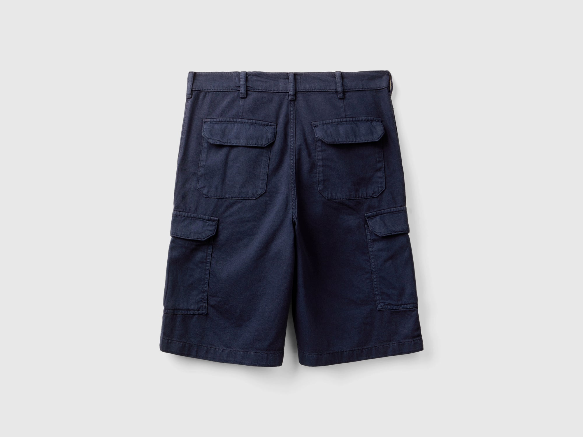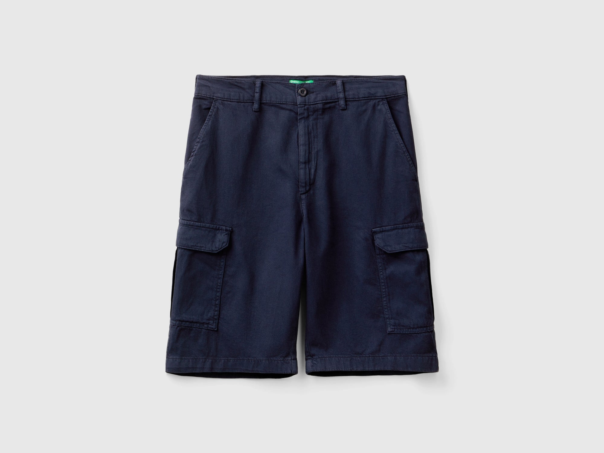 Bermuda modello cargo in misto cotone e lino tinto capo dalla vestibilità regolare. Taglio classico con tasconi applicati sui lati. Apertura a zip e bottone, tasche frontali e taschini applicati sul retro. Stile casual d'ispirazione workwear.