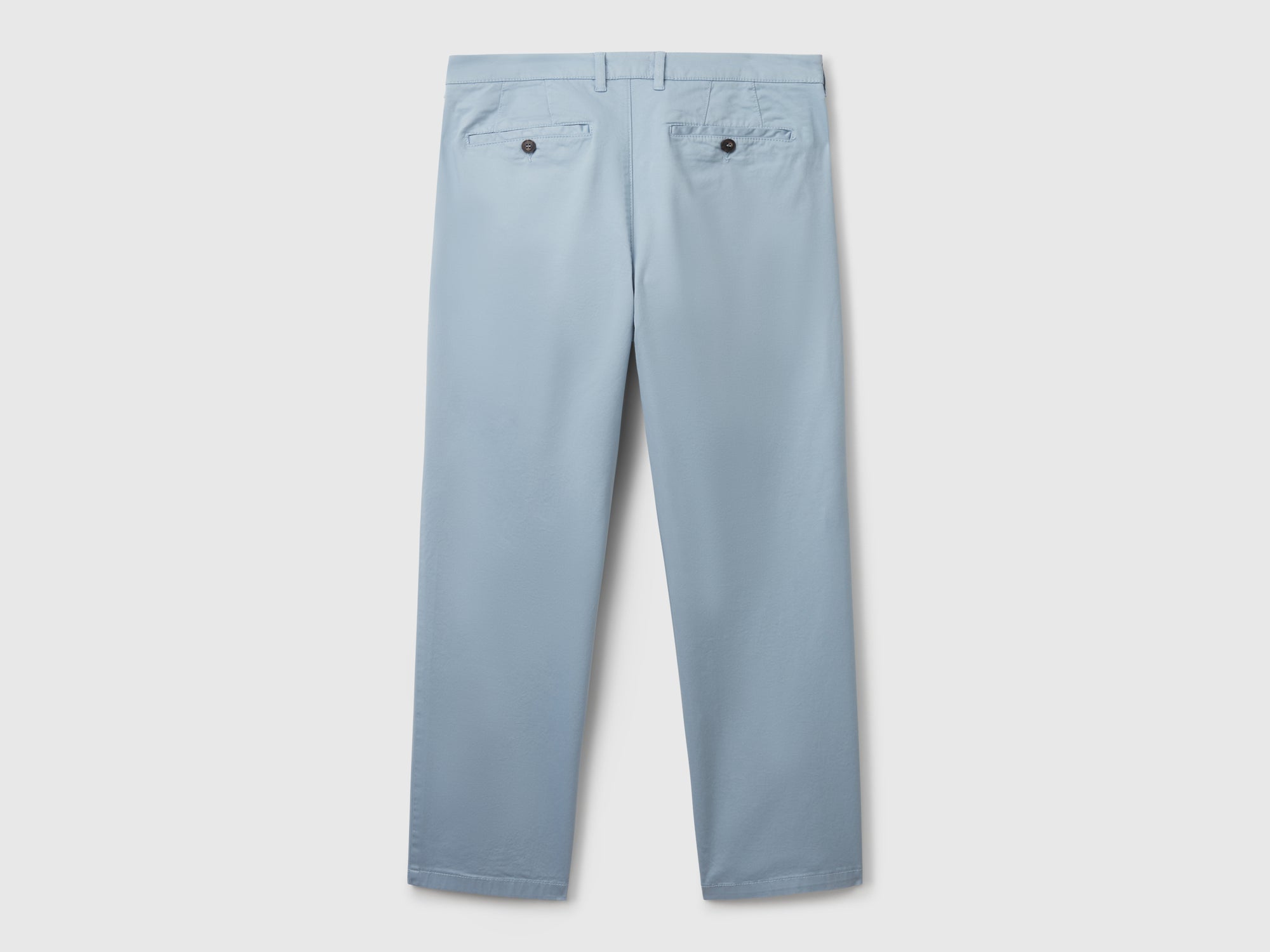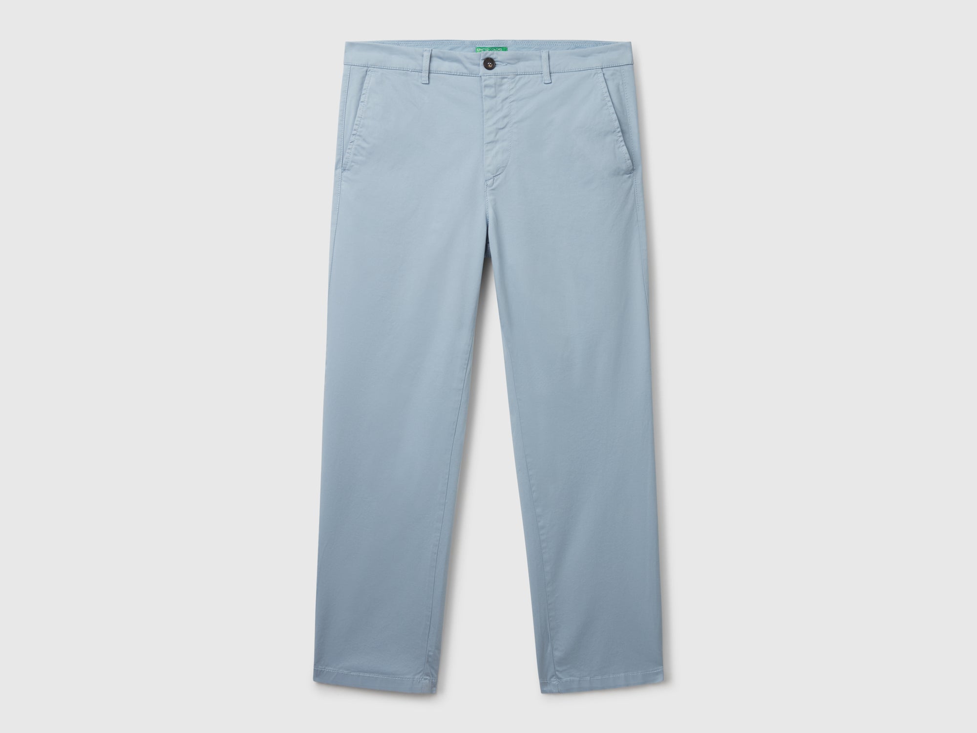 Pantaloni lunghi modello chino in cotone elasticizzato tinto capo. Pratica apertura con zip e bottone, tasche davanti e taschini a filetto sul retro. Vestibilità dritta, stile casual e massimo comfort.
