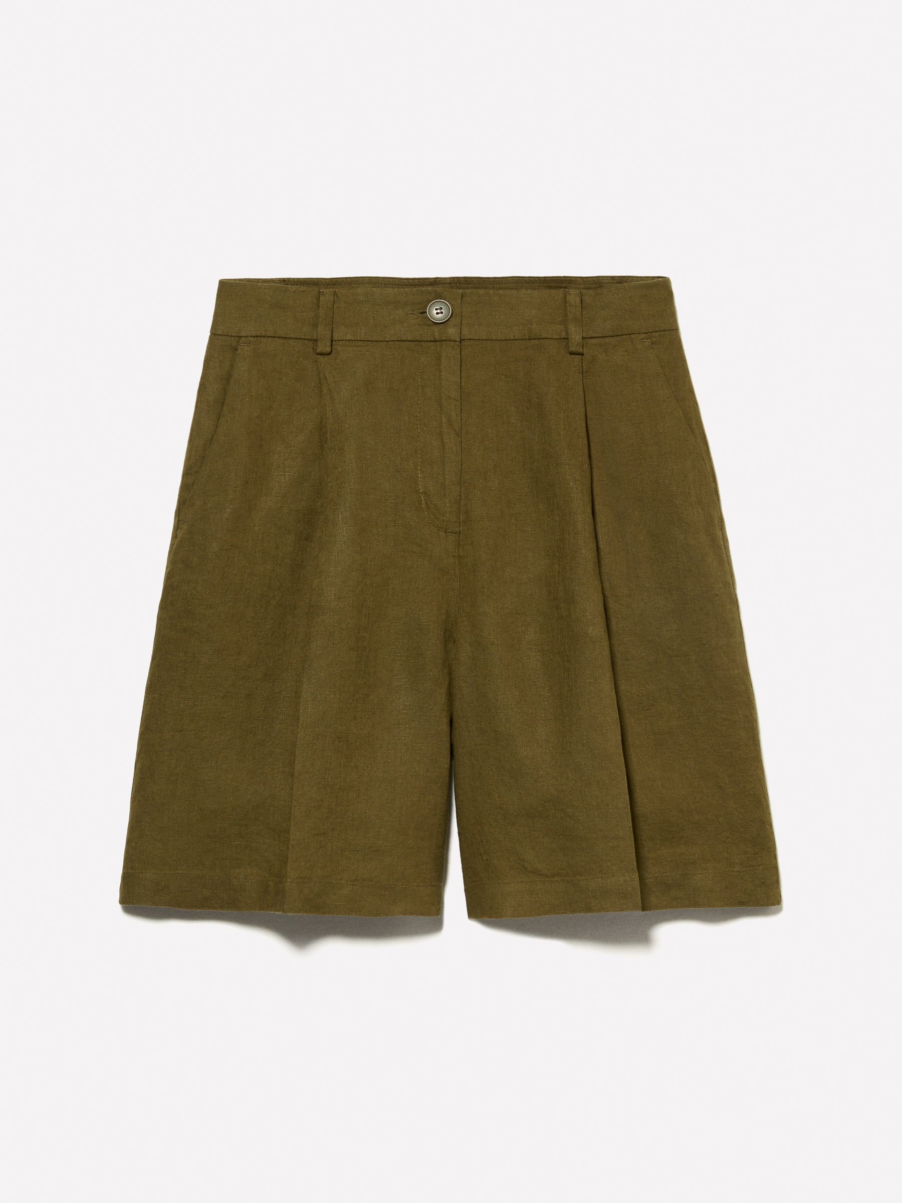 Bermuda verde militare in 100% lino a vita alta. Pinces frontali, chiusura a zip e bottone, due tasche alla francese davanti e due tasche a filetto dietro. Articolo realizzato con materiale in 100% lino coltivato in Europa.