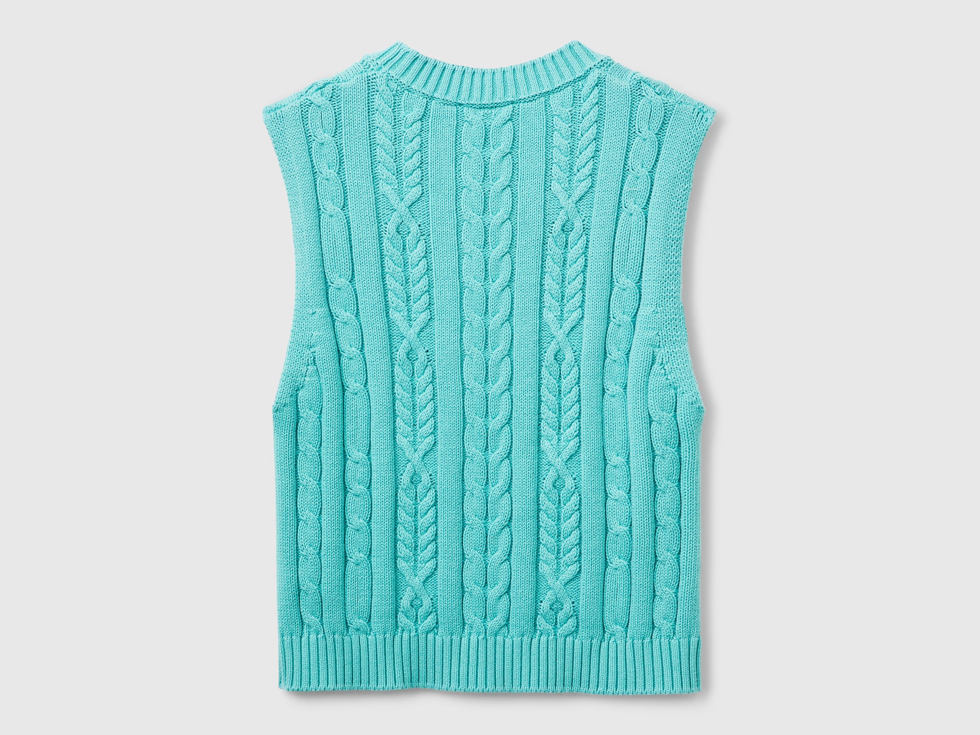 Gilet girocollo in puro cotone dalla vestibilità corta. Lavorazione a trecce e coste su tutto il capo. Morbido e femminile, perfetto come strato extra.
