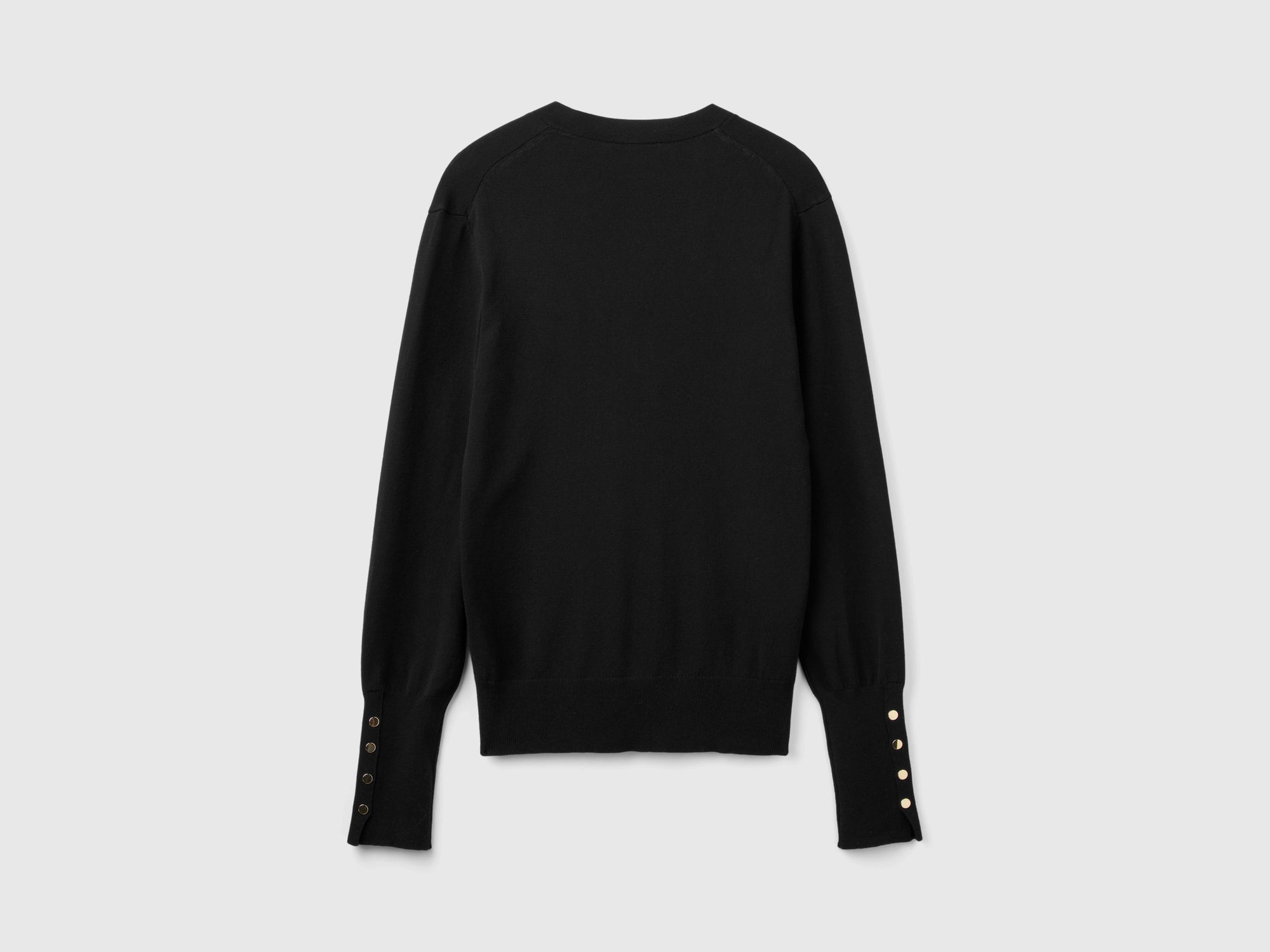 Maglioncino in morbido filato di misto viscosa con scollo a V. Vestibilità aderente e manica lunga con bottoncini decorativi e spacchetto sul fondo. Per look casual-chic sempre attuali.
