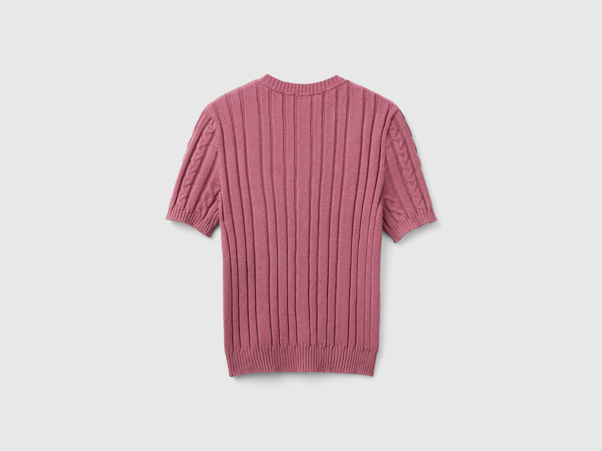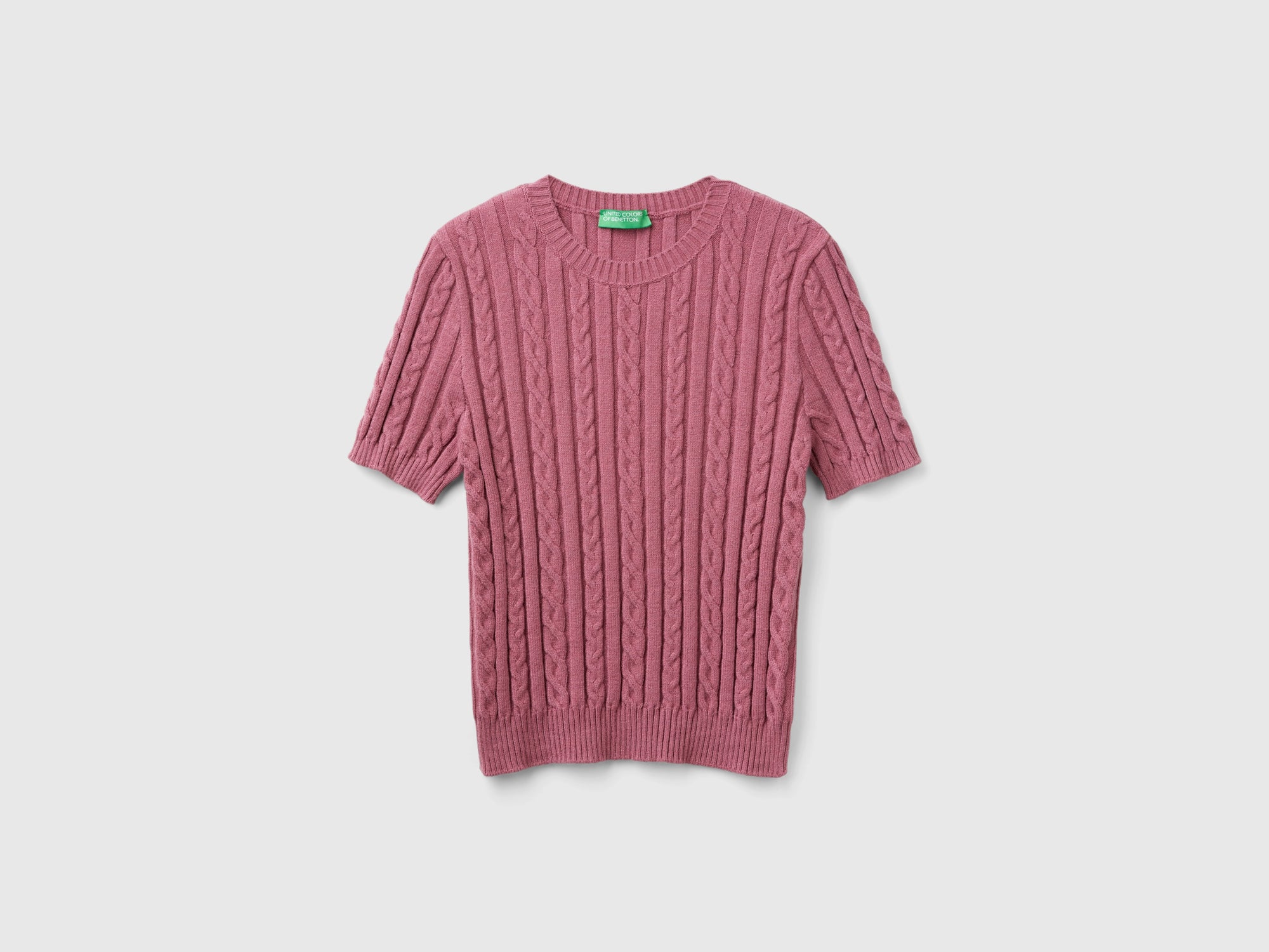 Maglia girocollo a manica corta in morbido filato di misto viscosa dalla vestibilità aderente. Lavorazione alternata con trecce e costine. Questo capo è stato lavorato in uno stabilimento in Croazia che riutilizza circa il 60% delle acque di scarico, riducendo il consumo di acqua usata nel processo di tintura. Per info: https://wasatex.eu