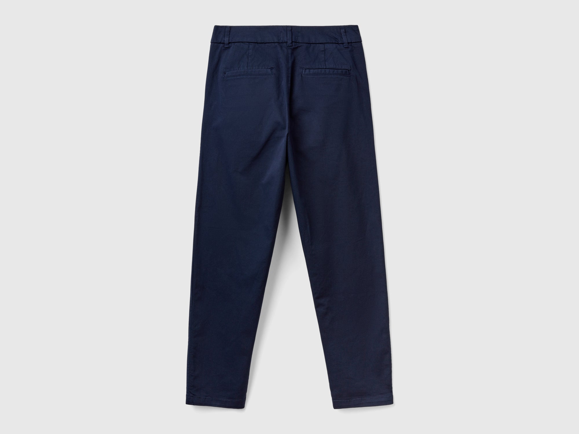 Pantaloni modello chino in cotone elasticizzato. Vita regolare con lunghezza alla caviglia e gamba rilassata. Apertura a zip e bottone, tasche davanti e taschini applicati sul retro. Casual al punto giusto, da indossare anche con risvolto sul fondo.