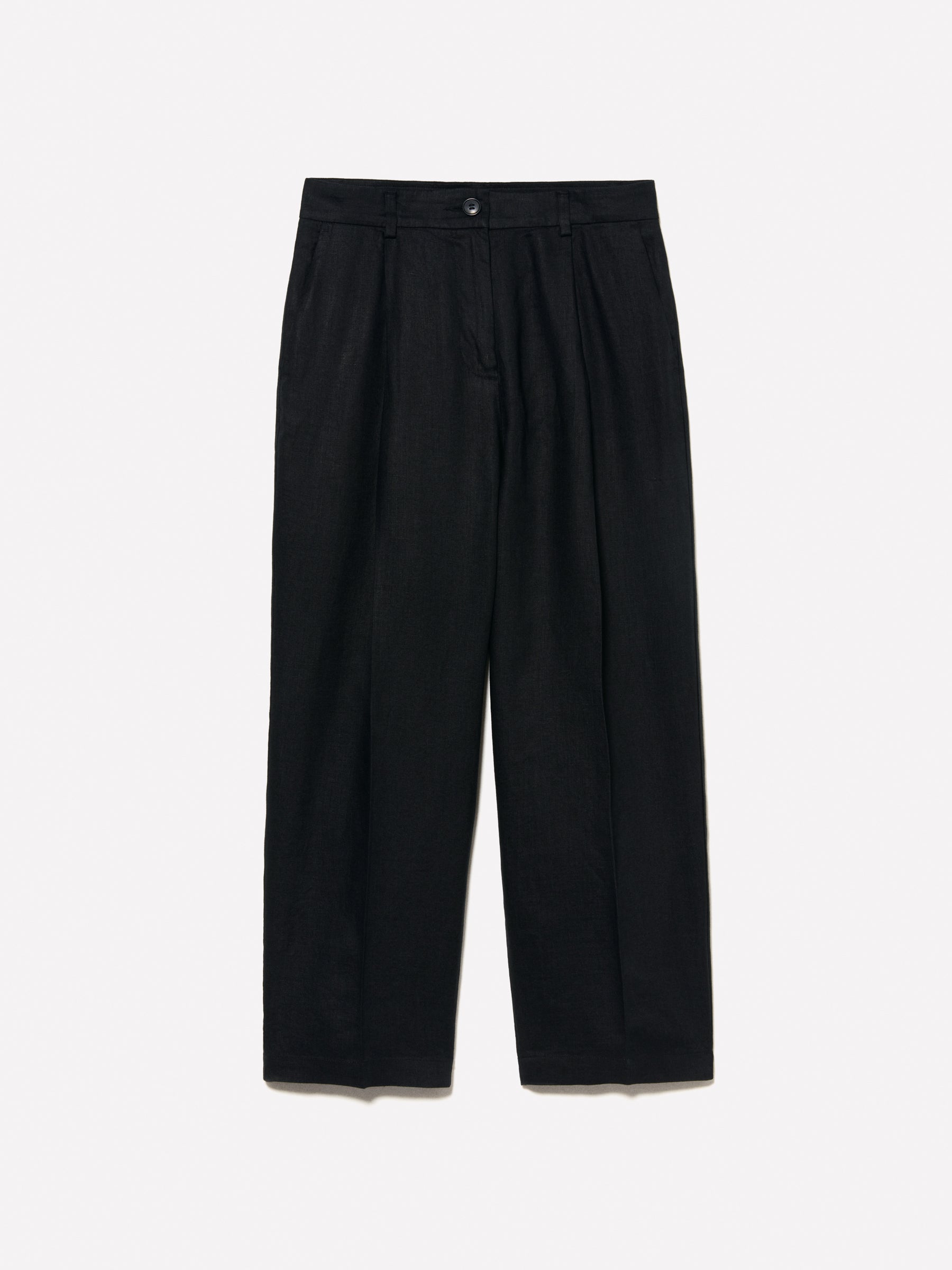 Pantaloni neri relaxed fit in 100% lino, con motivo di pieghe centrali davanti. Passanti in vita, chiusura a zip e bottone, due tasche alla francese davanti e due tasche a filetto dietro. Articolo realizzato con materiale in 100% lino coltivato in Europa.