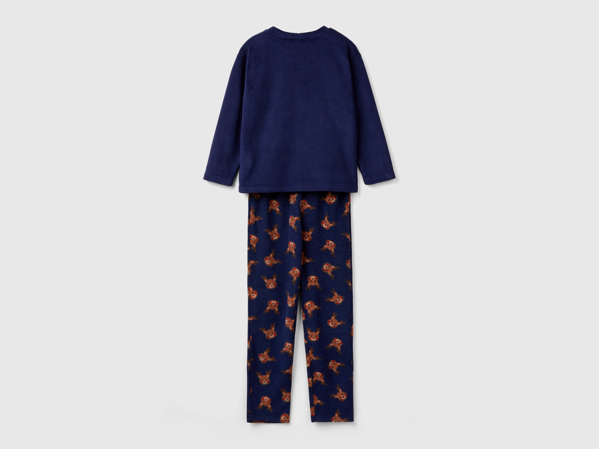 Pigiama lungo in caldo e morbido pile. Maglia girocollo a manica lunga con stampa renna e dettagli. Pantaloni lunghi con stampa renne su tutto il capo, cavigliera sul fondo gamba. Per serate di festa in famiglia con un pizzico di ironia.