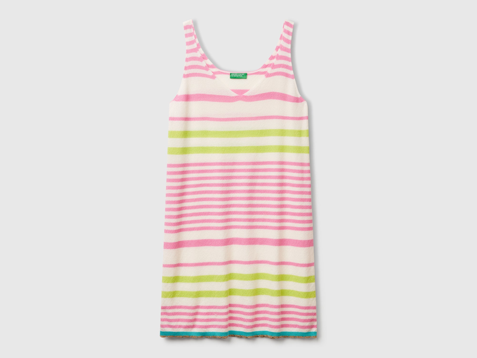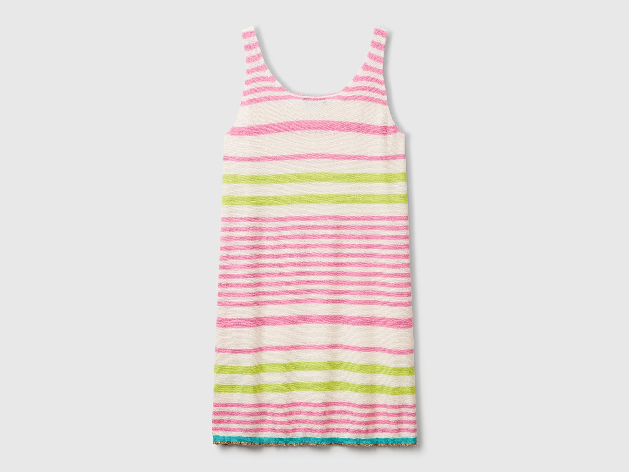 Abito corto smanicato in morbida maglia di puro cotone tricot. Spalline sottili, scollo a V e bordo ondulato sul fondo. Motivo a righe orizzontali multicolor su tutto il capo.