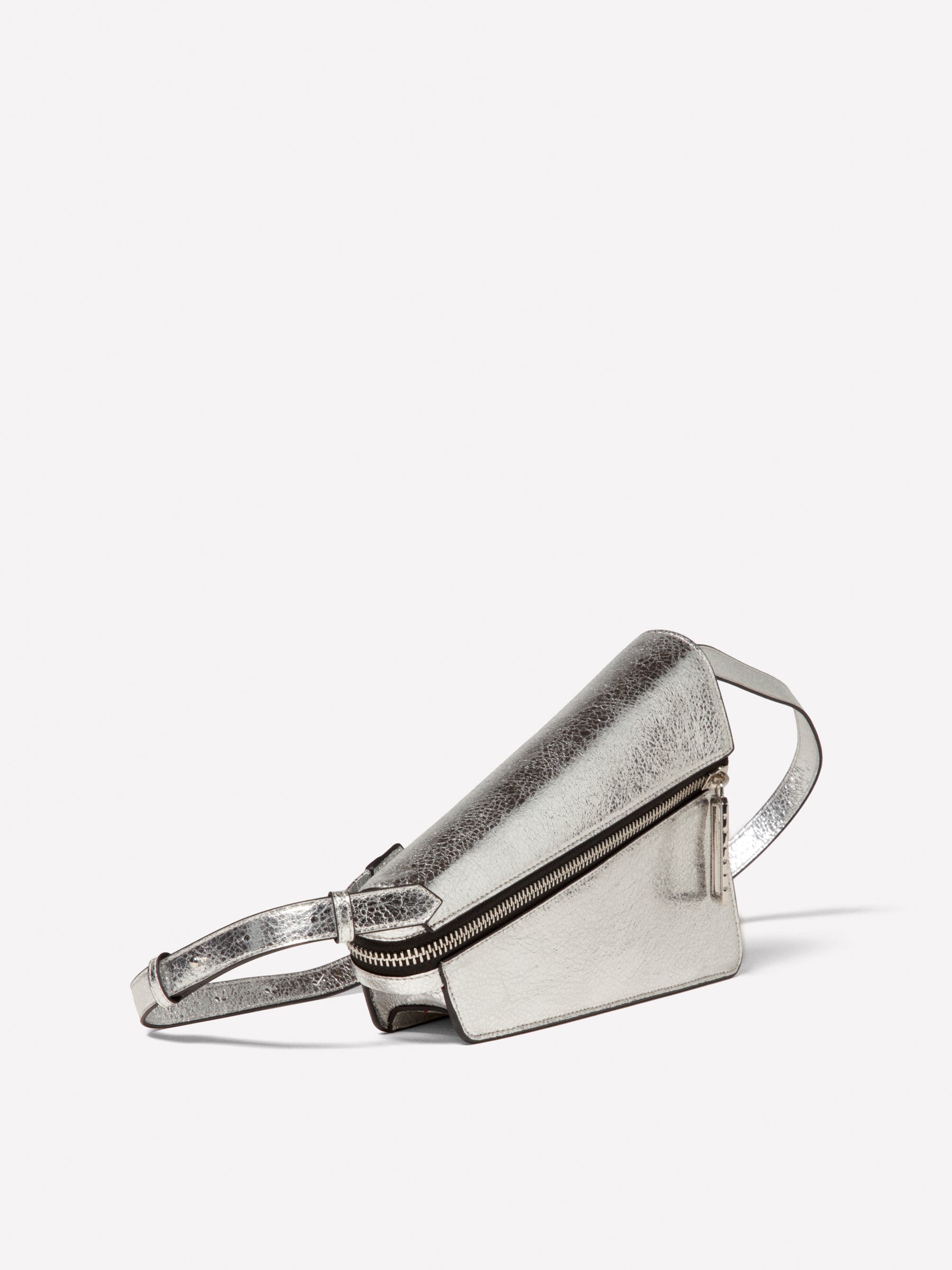 Borsa asimmetrica in tessuto spalmato argentato. Chiusura con cerniera e tirazip logato, taschino interno a contrasto e tracolla regolabile e removibile.