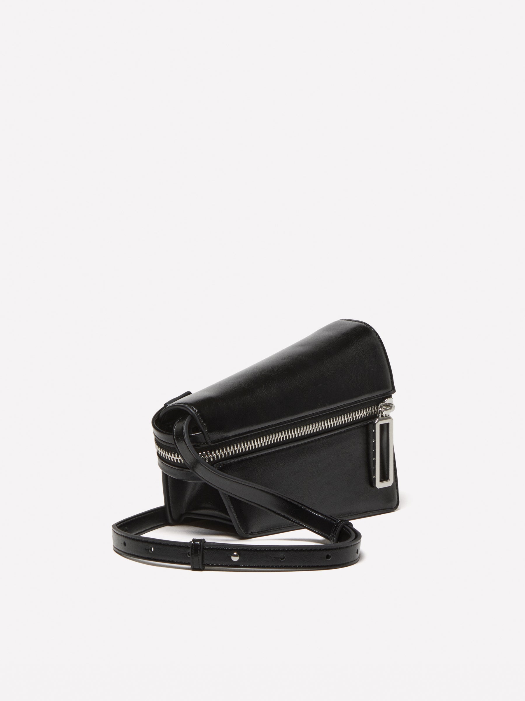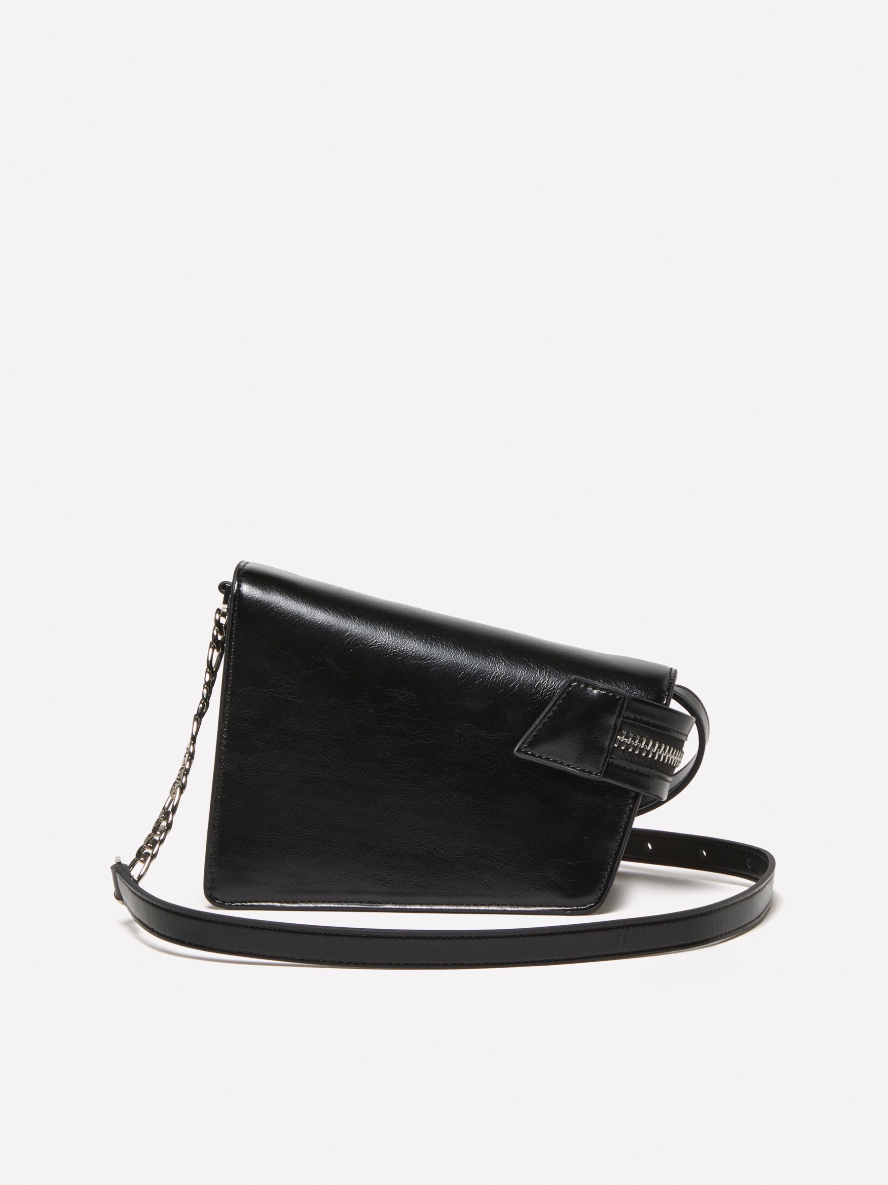 Borsa asimmetrica piccola in tessuto spalmato nero. Chiusura con cerniera e tirazip logato, taschino interno a contrasto e tracolla con inserto a catena regolabile e removibile.