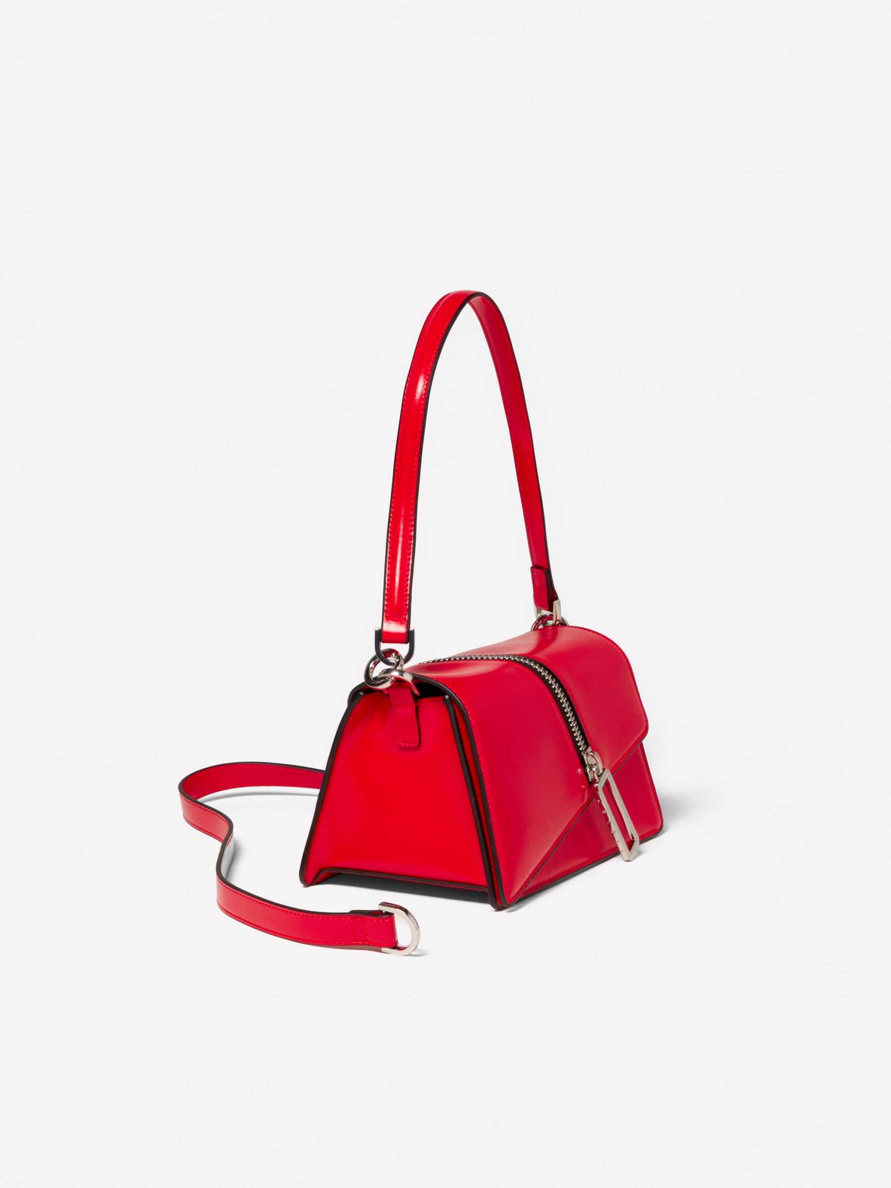 Borsa a spalla in tessuto spalmato rosso, con dettaglio di cerniera con maxi tirazip sul davanti. Patta chiusa da bottone magnetico, tasca interna e tracolla regolabile e removibile.