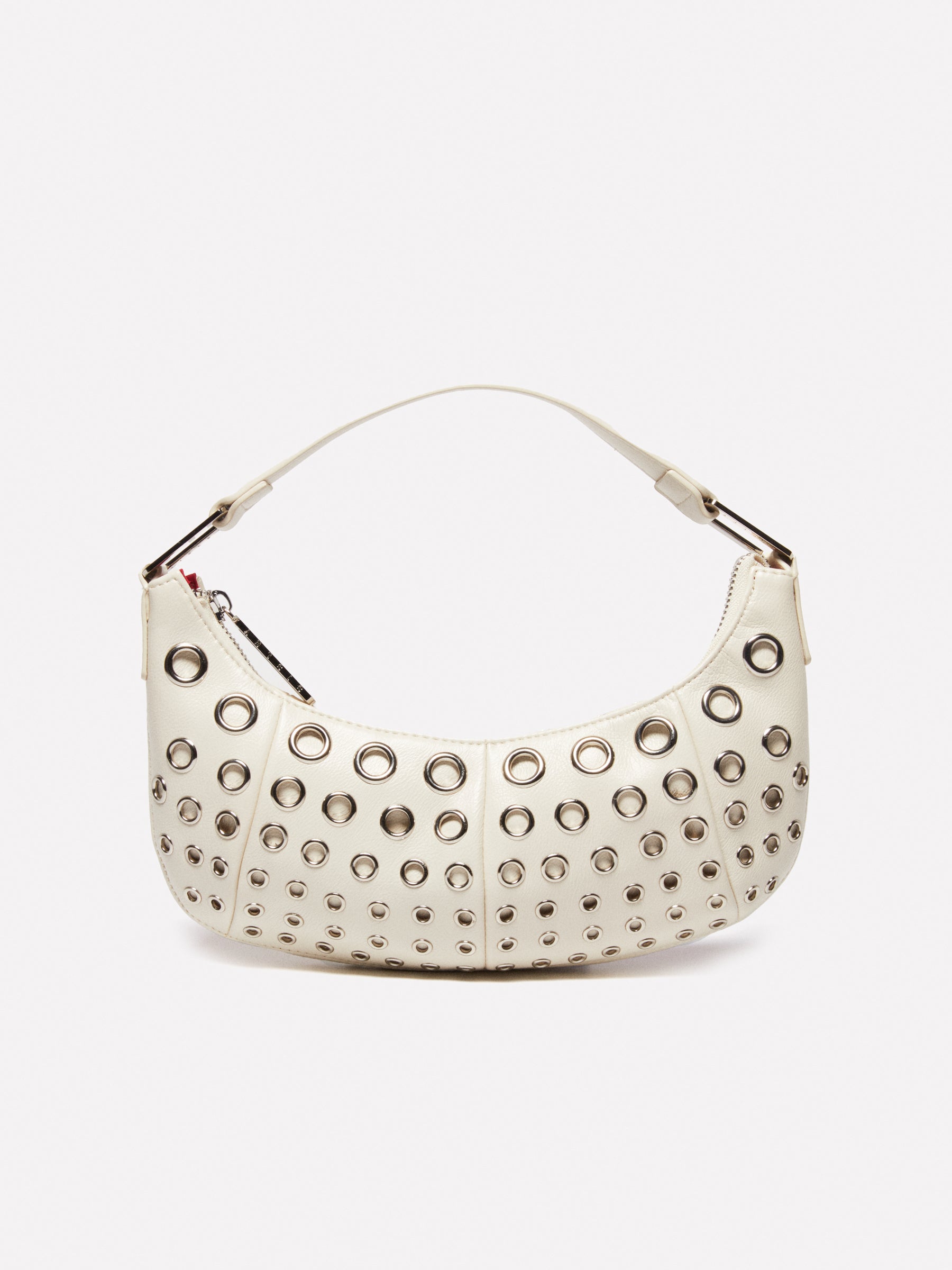 Mini hobo a spalla in tessuto spalmato bianco panna, con dettaglio di occhielli metallici davanti e dietro. Singolo manico, chiusura in testa con cerniera e tirazip logato, taschino interno e fodera a contrasto.