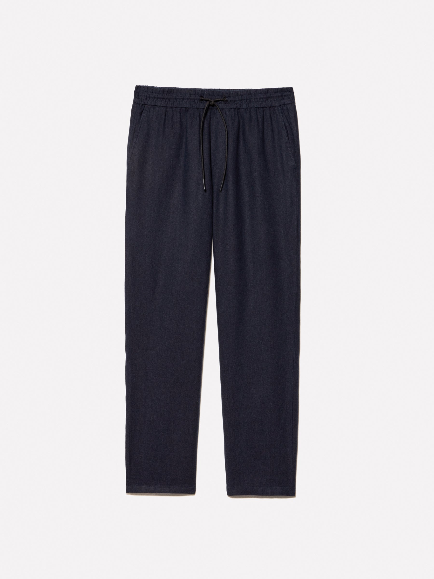Pantaloni jogger blu scuro in 100% lino. Elastico con coulisse in vita, due tasche inserite nei fianchi, due tasche a toppa dietro e risvolto sul fondo. Articolo realizzato con materiale in 100% lino coltivato in Europa.
