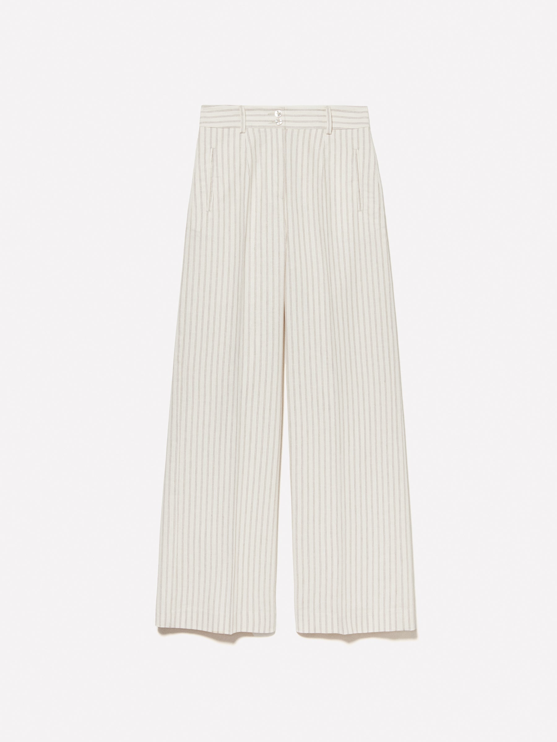 Pantaloni a vita alta in misto cotone e lino tinto filo a righe. Piega stirata lungo la gamba, chiusura con zip e doppio bottone, due tasche a doppio filetto ai fianchi e due tasche a doppio filetto dietro.