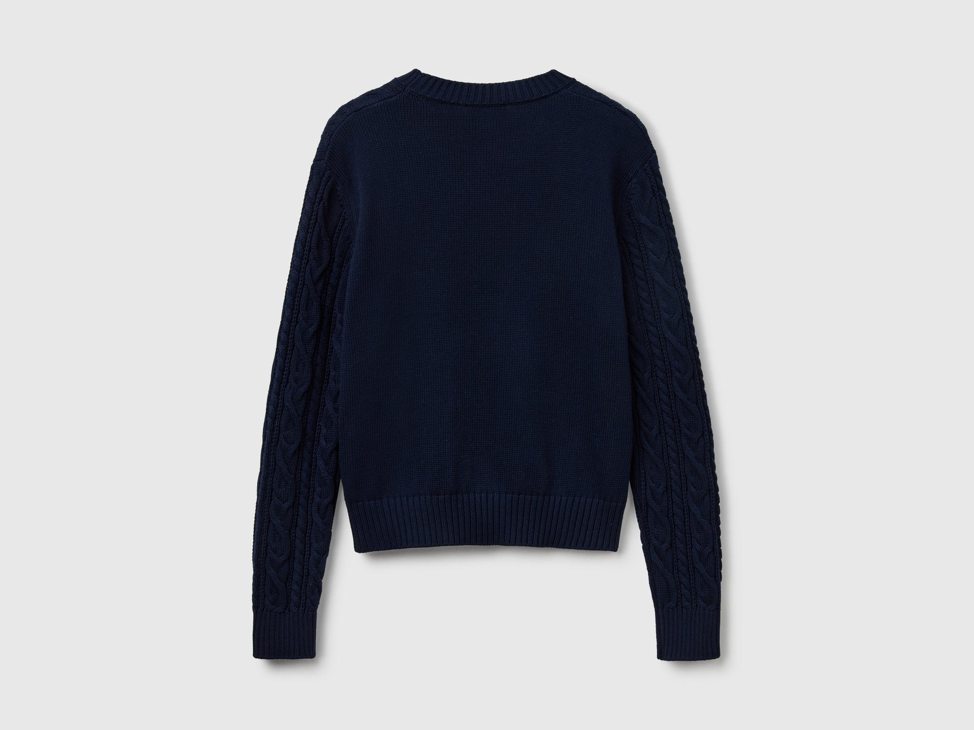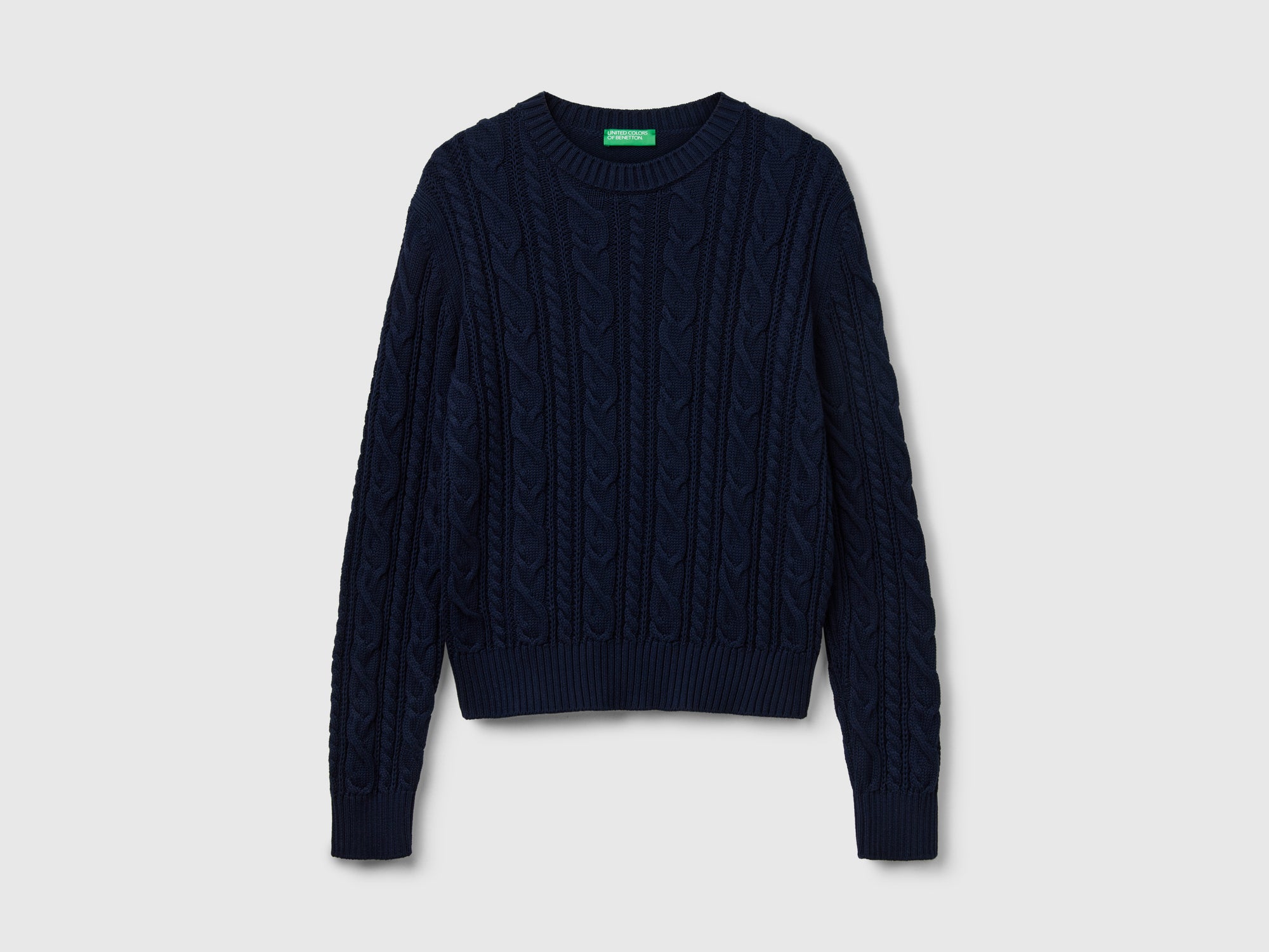 Maglioncino girocollo in puro cotone, con lavorazione a trecce verticali sul davanti e lungo le maniche. Un nuovo classico del guardaroba casual, per accendere anche i look più semplici.